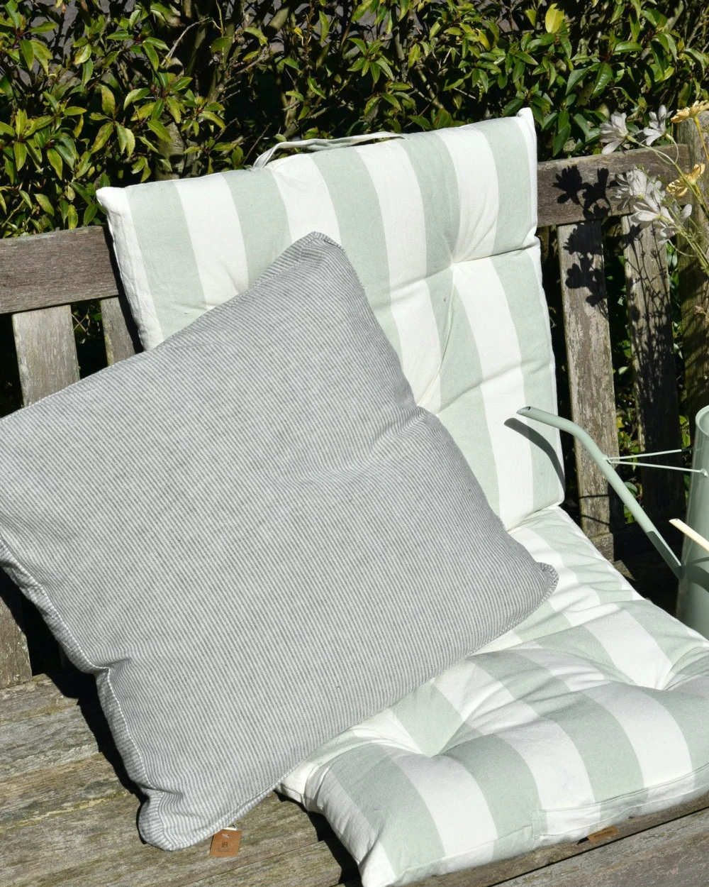 Box kussenhoes met fijne groene strepen, IB Laursen. Deze mooie box kussenhoes is fijn gestreept met gebroken wit en pastel groen. Het kussen is vierkant en heeft een strook rondom zodat het een box kussen model is. Het kussen is 45×45 cm en er past een 50×50 binnenkussen in zodat het een box kussen model wordt. U kunt het kussen goed combineren met andere kussen en verschillende groen tinten. Ook het leuke buitenkussen met grove strepen past erg goed bij elkaar.
