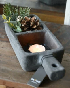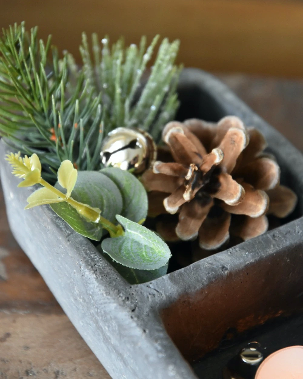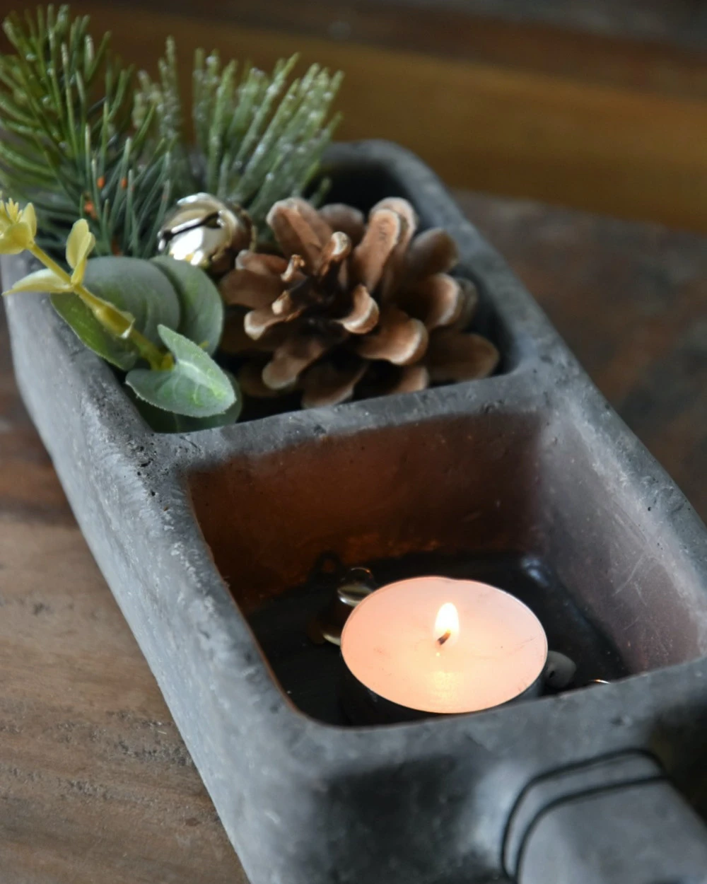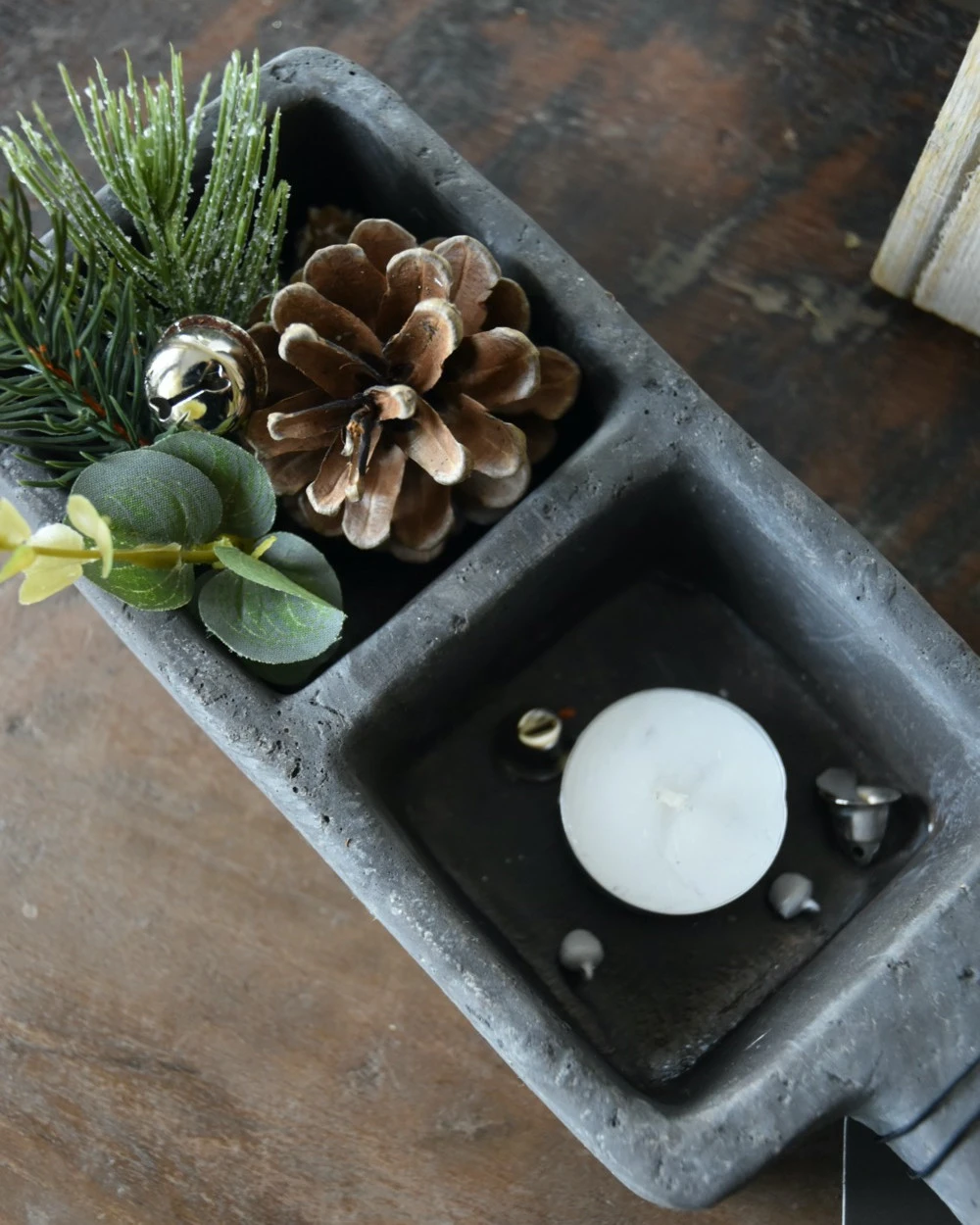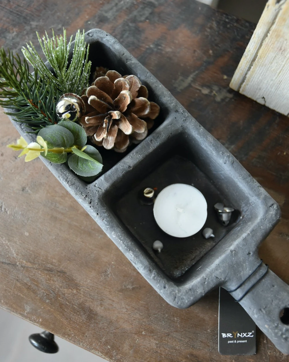 Compleet set met Brynxz vakkenbak, groen decoratie en kaarsje. Dit leuke set bestaat uit een twee vaks-bak met oor van Brynxz met daarin kerstgroen en een dennenappel en een belletje in het ene vak en in het andere vak een waxinelichtje met klokjes en belletjes. Het groen is zijde/kunst zodat u er heel lang plezier van heeft en kan er later ook weer gemakkelijk uit worden gehaald zodat u een leuke bak overhoud voor wat theezakjes, bonbons, droogbloemen of kaarsjes bijvoorbeeld….