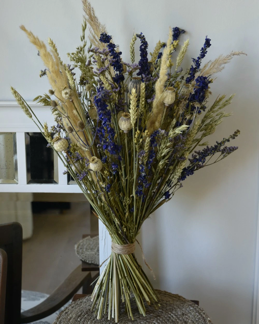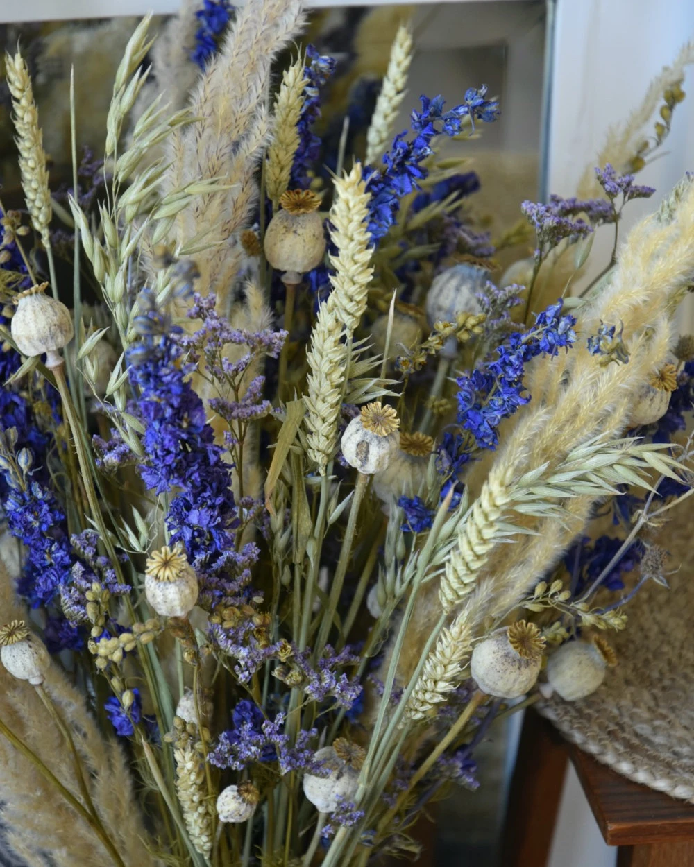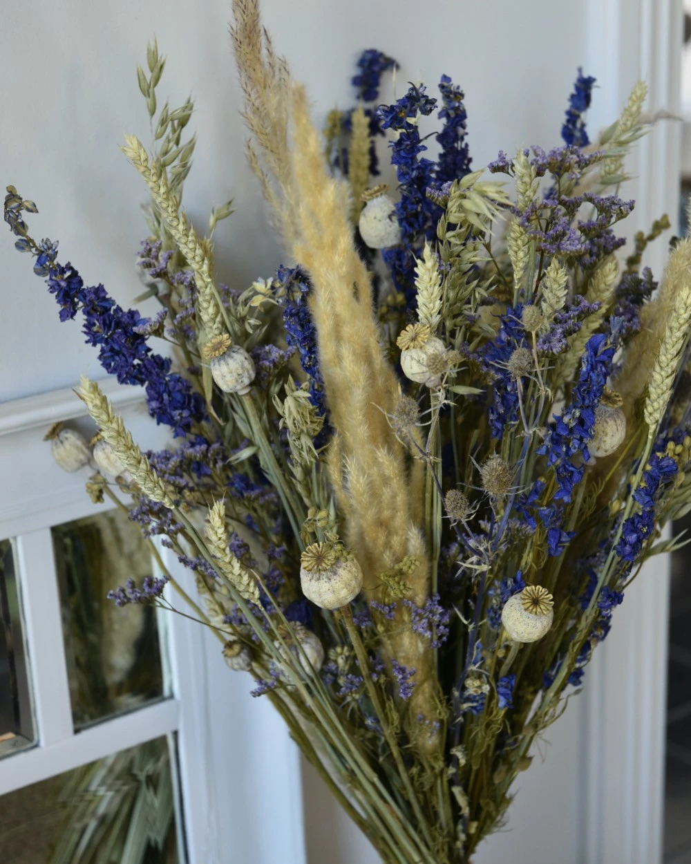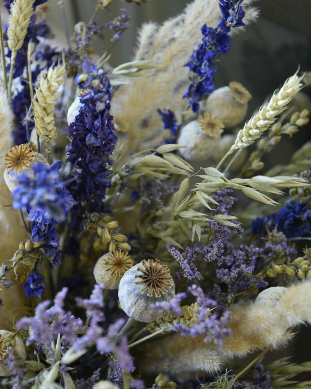 Droogbloem pluk boeket in naturel blauw lila. Dit prachtige boeket van droogbloemen in de tinten naturel blauw lila is in verschillende hoogtes gedraaid voor het mooiste effect. In het boeket zit o.a. Papavers, Delphinium, Limonium, Tarwe, Haver, Disteltjes en grote Erianthus pluimen. De bloemen harmoniëren mooi met elkaar in kleuren en vormen en versterken elkaar tot dit prachtige boeket. U kunt de bloemen zo in een mooie pot, kan of vaas plaatsen.