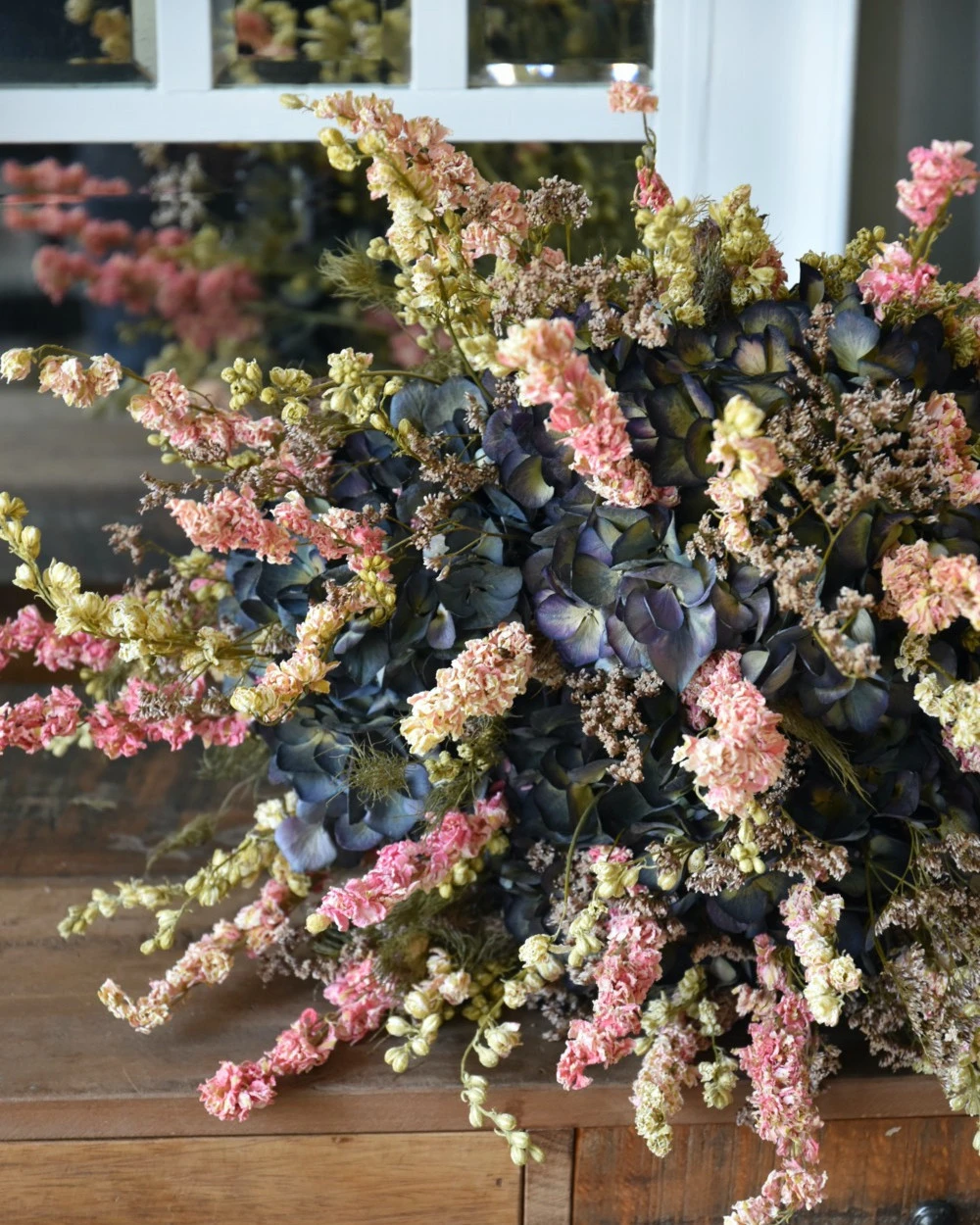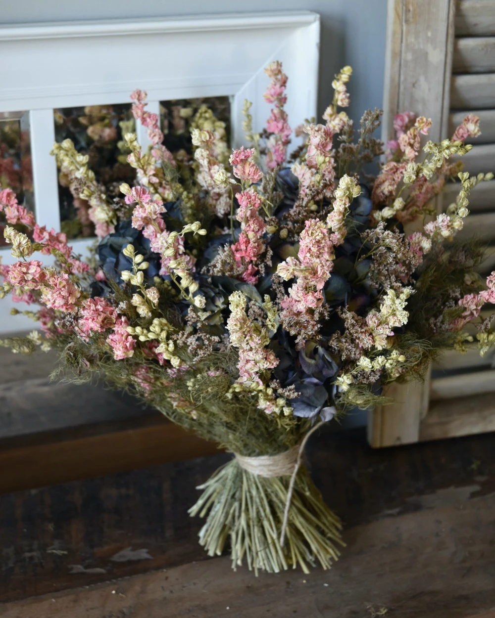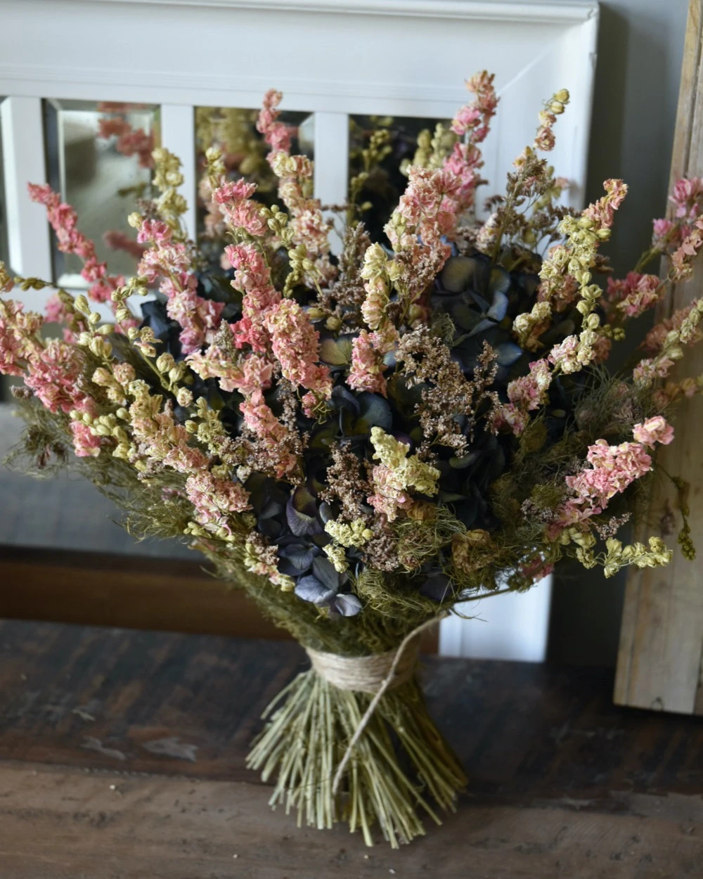 Droogbloemen biedermeier met Hortensia’s en Riddersporen. Dit prachtige grote biedermeier boeket van droogbloemen is compact opgebonden en is met Hortensia’s, Riddersporen, Juffertjes groen en Zee Lavendel (Limonium) gemaakt. Het boeket is in lagen opgemaakt waarin de Hortensia’s de basis vormen met daarboven de luchtige Zee Lavendel/Limonium en de Riddersporen in groen/roze die weer hoger komen en het Juffertjes groen eromheen. Hierdoor geeft deze biedermeier extra diepte waar de Hortensia’s wat donkerder zijn en de Limonium iets lichter en de Ridderspoen nog lichter van kleur. Het boeket is met touw gebonden en u kunt het zo op een mooie kan of vaas zetten. Wij adviseren om het touw niet los te maken om het model intact te houden.