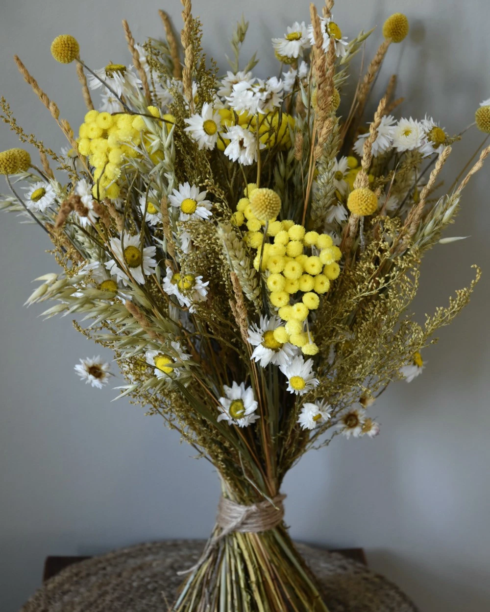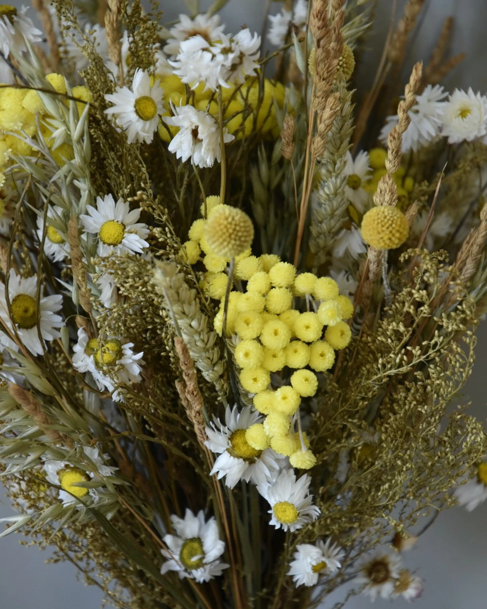 Droogbloemen boeket in naturel geel en wit. Dit mooie boeket in met vrolijke geel wit tinten is van droogbloemen gemaakt. Het boeket is korenschoof gemengd op iets verschillende hoogtes voor een mooi effect gebonden en in mooie naturel, geel en witte tinten. In het boeket zit o.a. bijzondere fijne Helichrysum, Acroclinium, Solidago, Kropaar, Tarwe, Haver en Craspedia’s verwerkt. Het boeket is met touw gebonden waardoor u het zo op een vaas of pot kunt zetten.