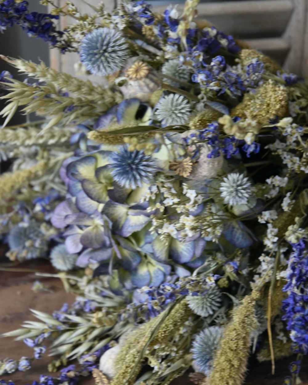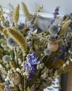 Droogbloemen boeket met Hortensia en Kogeldistels groen blauw. Dit mooie droogbloemen boeket is in groen blauwe tinten en heeft als hart een gedroogde Boeren Hortensia met daaromheen Kogeldistels, Setaria pluimen, fijne witte Limonium, Haver, Tarwe, Papavers en Delphinium/Riddersporen. De tinten combineren mooi en gaan in elkaar op. U kunt het boeket zo op een vaas of mooie pot zetten. We adviseren om het touw te laten zitten om het model te behouden.
