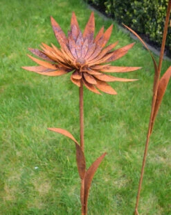 Ecoroest tuinprikker gevulde Chrysant. Deze mooie bloemen tuinprikker in model van een gevulde Chrysant is van ecoroest en kan als tuindecoratie tussen de beplanting in uw tuin worden gezet. Deze prachtige tuinprikker staat op een lange steel met blad die u zo u zo in de grond kunt prikken. U kunt verschillende bloemen eventueel naar wens combineren om zo een mooi geheel te vormen.
