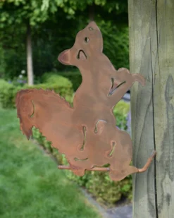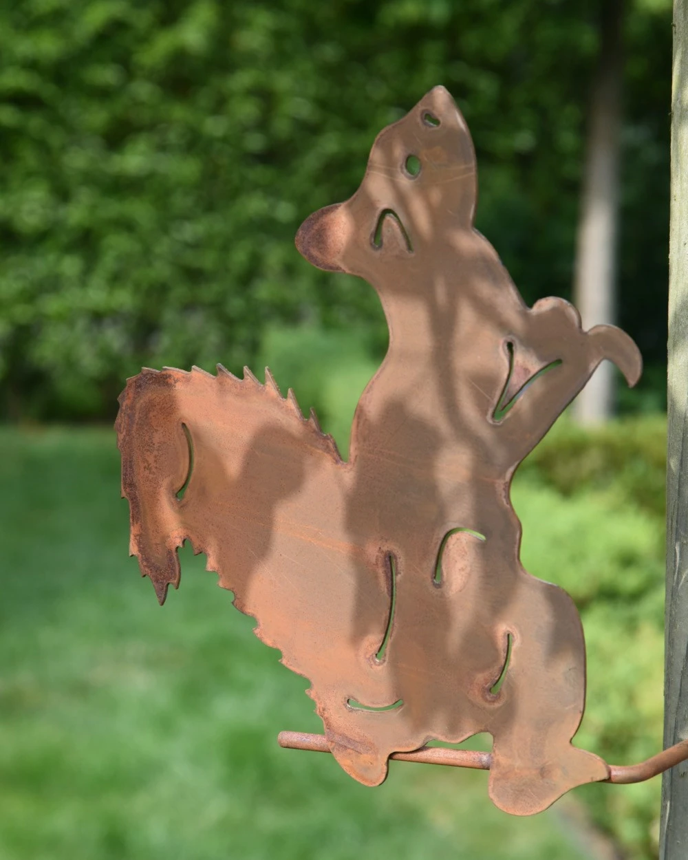 Eekhoorn zittend op stok ecoroest tuindecoratie. Deze leuke Eekhoorn met een mooie volle staart zit op een stokje/takje om zo naar boven te kijken/springen. De tuindecoratie is van ecoroest gemaakt die door een speciale behandeling een mooie roestlaag heeft gekregen. Aan de 3D stok (die om de hoek gaat, voor een mooi effect) zit een schroefeind zodat u de Eekhoorn gemakkelijk in een boompaal of schutting kan worden geschroefd. (wel even voorboren) U kunt zo lang genieten van dit silhouet in uw tuin…