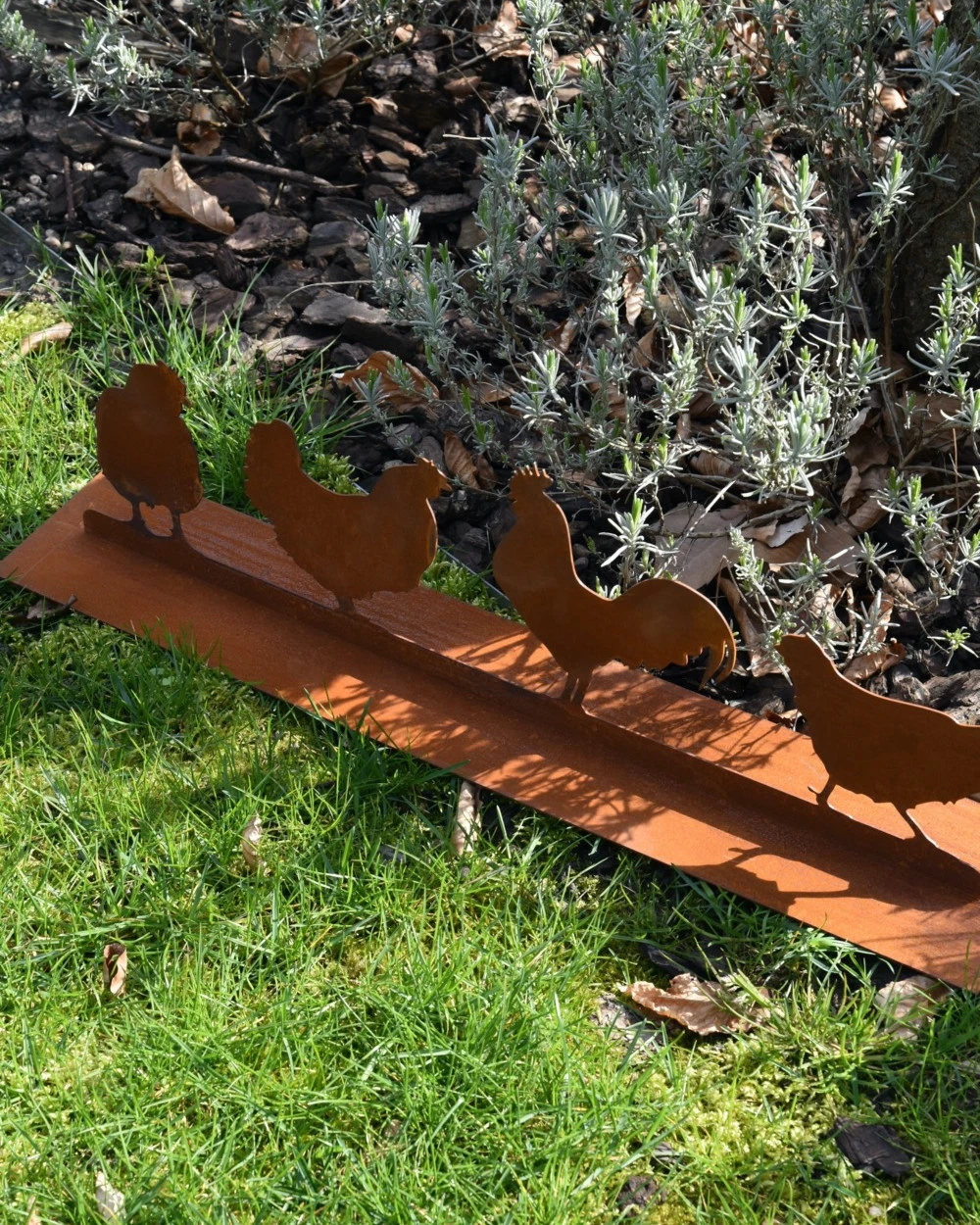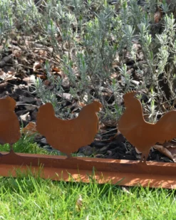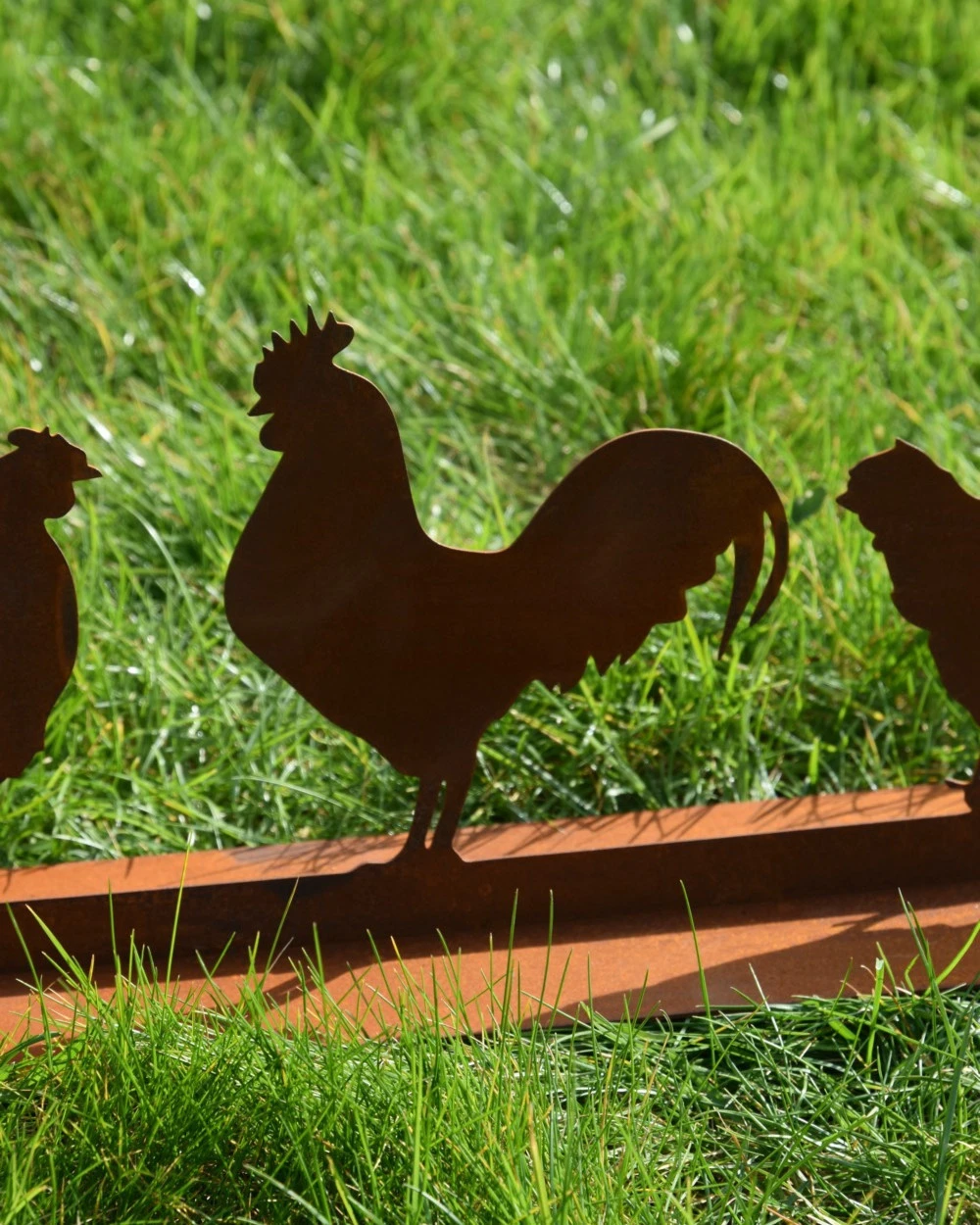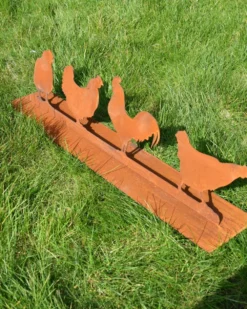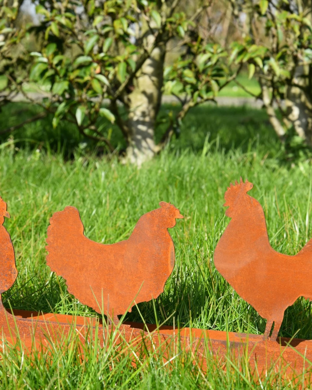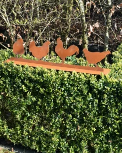 Familie kip met haan Ecoroest tuindecoratie. Deze leuke familie kip staat op een plaat die u zo neer kunt zetten in de tuin. Op de plaat staan 3 kippen en een haan elk in een andere positie zodat er een gezellig tafereel is ontstaan. U kunt het geheel zo in de tuin zetten en de plaat eventueel bedekken met wat houtsnippers zodat het net lijkt of de kippen familie gezellig in de tuin loopt. Door de leuke silhouetten kunt u heel het jaar genieten van de kippen terwijl het seizoen erom heen zijn gang gaat en er door het licht gespeeld wordt met het licht en de kleur….
