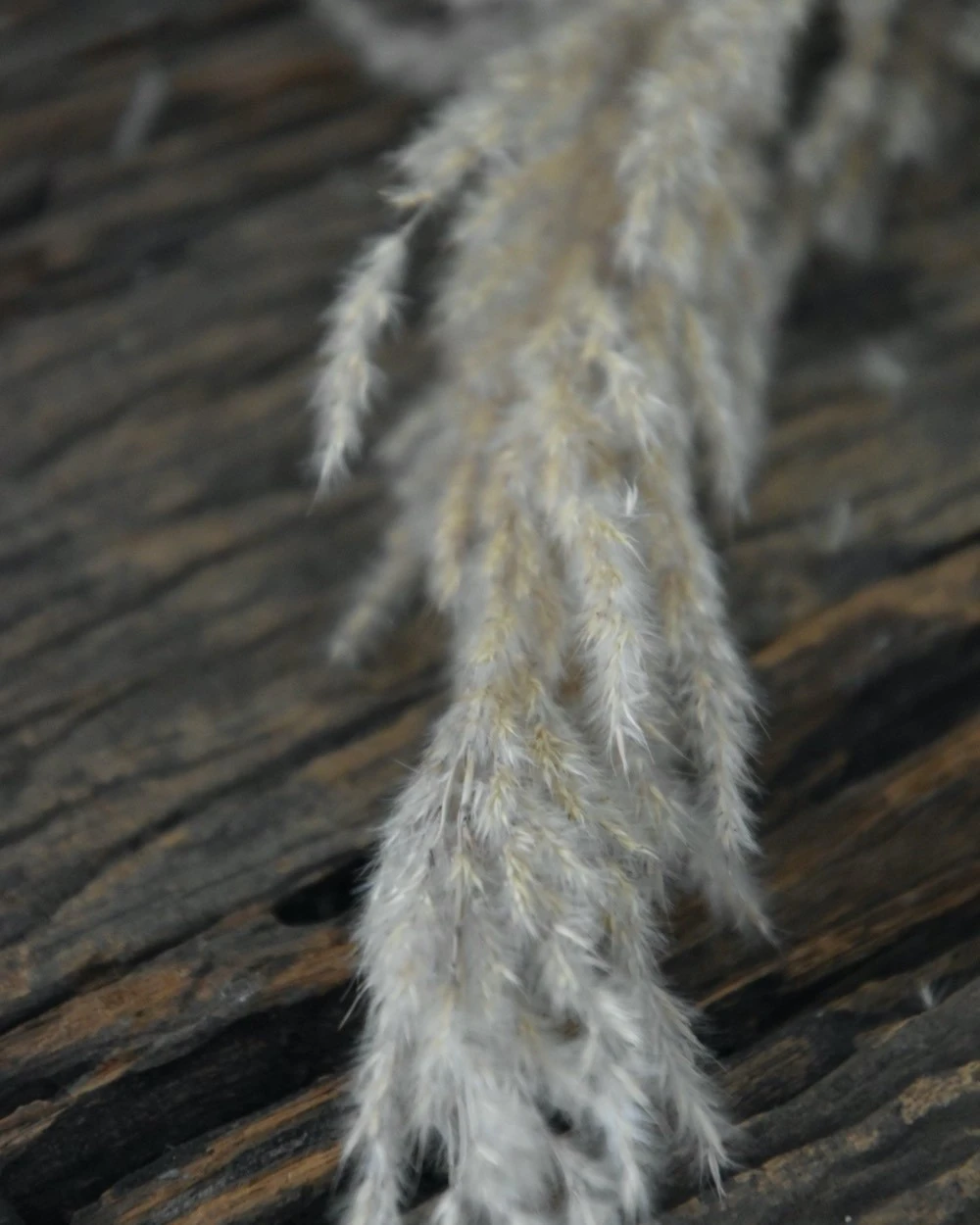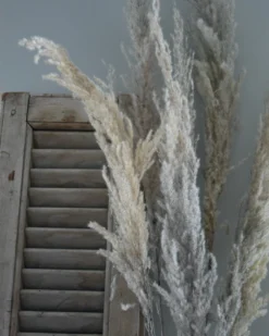 Gedroogde Pampas pluim. Deze pampas pluim is iets wolliger in uiterlijk, dit komt doordat ze iets verder gerijpt zijn. Ze komen het mooiste tot zijn recht in een grote vaas met enkel pluimen daarin. De bos gaat per 8 stelen.