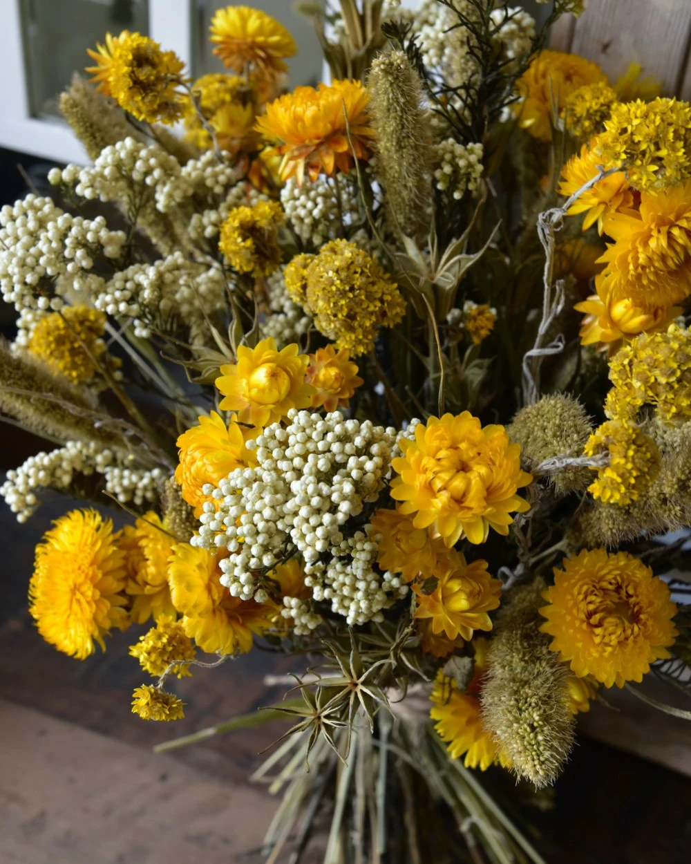 Gemengd droogbloemen biedermeier boeket in geel wit en groen. Dit mooie boeket droogbloemen is in warm geel met wit en groen korenschoof gebonden als een biedermeier. Het boeket is opgemaakt met o.a. Helichrysum, Setaria, Sanfordii, gepreserveerde Riceflower en Nigella sterren (zaaddozen). U kunt het boeket zo op een mooie vaas/pot zetten en van het geheel genieten.