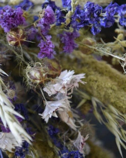 Gemengd droogbloemen boeket in naturel groen lila en blauw. Dit prachtige volle droogbloem boeket is opgemaakt in tinten groen, blauw, lila en violet. In het boeket zit o.a. Riddersporen/Delphinium, Disteltjes, Juffertjes, Rodanthe, Setaria pluimen, Haver en Statice. Het boeket is gemengd opgemaakt op verschillende hoogtes en korenschoof gebonden met jute touw. De kleuren volgen elkaar mooi op en het boeket bevat veel verschillende bloemen zodat het altijd interessant is om naar te kijken. U kunt het boeket zo op een mooie vaas of kan zetten.