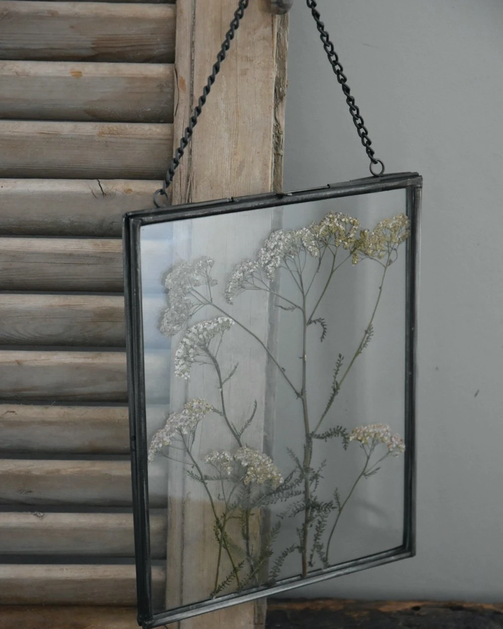 Geperste Schermbloemen in een lijst met kettinkje. Deze prachtige geperste Schermbloemen hebben een prachtige lichte kleur. De grote lijst is gevuld met geperste Schermbloemen in bloei en in de knop met wat blad. De lijst is van metaal met glas waar een kettinkje aan zit om de lijst mee op te hangen.
