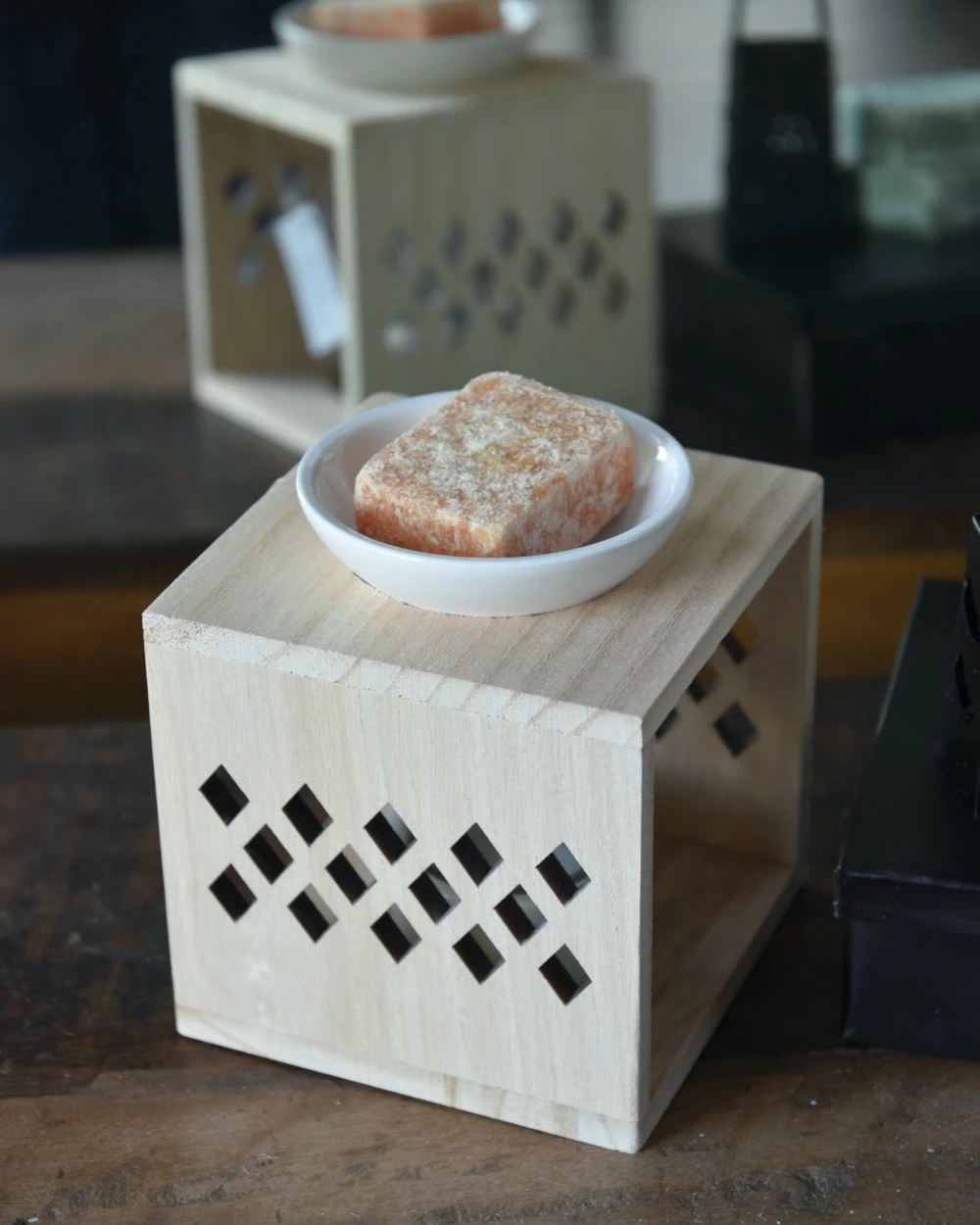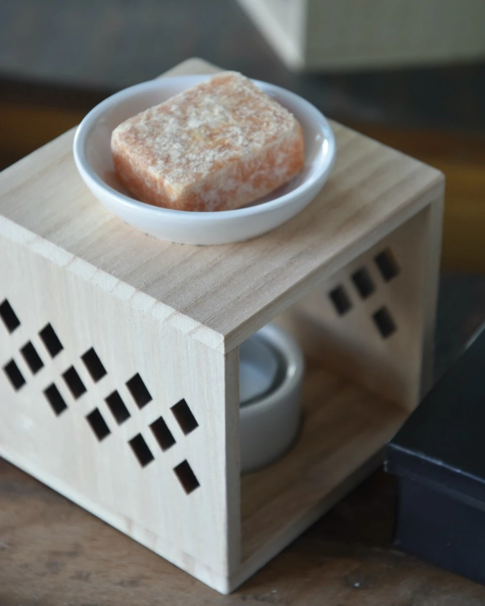 Geur brander hout met keramiek schaaltjes. Deze leuke geurbrander is in een kubus model en van naturel hout gemaakt met twee keramiek schaaltjes voor het waxinelichtje en voor een amber blokje. Aan de zijkanten van de brander zit een ruitvormige gaten patroon voor een sfeervol licht, wanneer er een amber blokje (of een stukje ervan) in het bovenste schaaltje wordt gelegd en gesmolten ontstaat er een heerlijke geur die nog intenser is. De brander is exclusief Amber blokje en waxinelichtje.