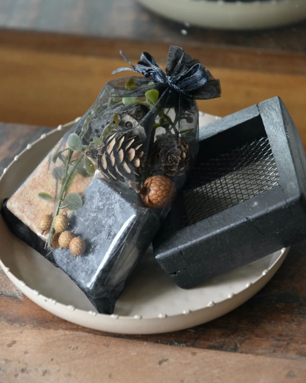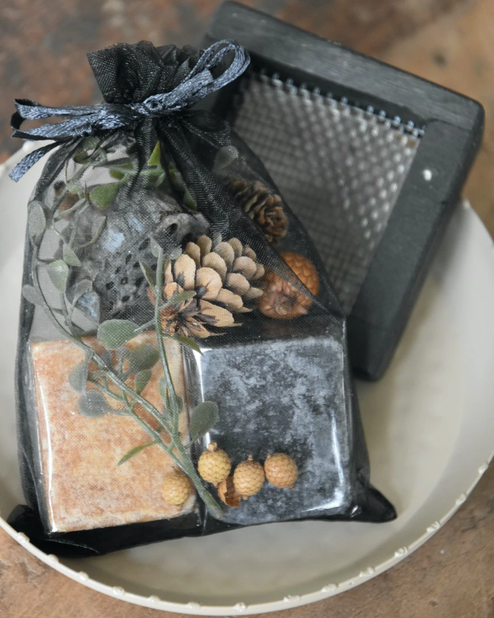 De Amber blokjes zitten per stuk in folie verpakt en zo samen met alle decoratie in het organza zakje, de rasp en het schaaltje zitten los (zie foto 2,4,6,8)