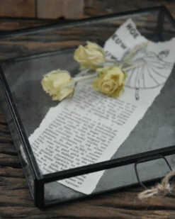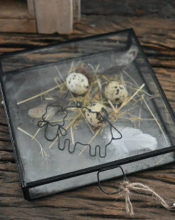 Glazen kistje met zinken bodem, IB Laursen. Dit kistje heeft een laag vierkant model. Het kistje heeft een zinken bodem en de zijkanten en het deksel zijn van glas. Het deksel heeft een metalen ‘sluiting’. Het kistje kan mooi worden gedecoreerd met bv gevriesdroogde bloemen, of in thema voor het voorjaar of met uw eigen bijzondere gedenkwaardige items. Doordat er met de hand het glas is ingelegd kunnen er kleine oneffenheden in het kistje zijn, dit hoort bij de charme van het product.