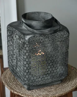 Groot metalen windlicht met weefpatroon en hengsel, vierkant. Dit mooie grote windlicht is van metaal met een mooi soort weefpatroon waartussen open gaatjes zitten waardoor het schijnsel van de kaars een mooi effect geeft. Het model is vierkant met van boven een ronde opening met hengsel. In het windlicht zit een houder waarin een cilinderglas staat waardoor de kaars minder last heeft van wind en mooi blijft branden. Het metaal heeft een ietwat donkere afwerking met lichtere poederachtige accenten die het patroon benadrukken en zo het geheel tot een prachtige groot windlicht maakt.