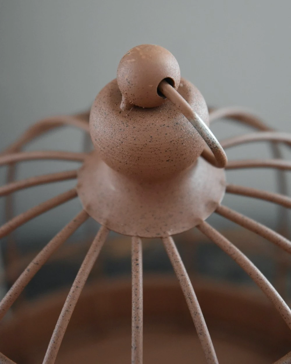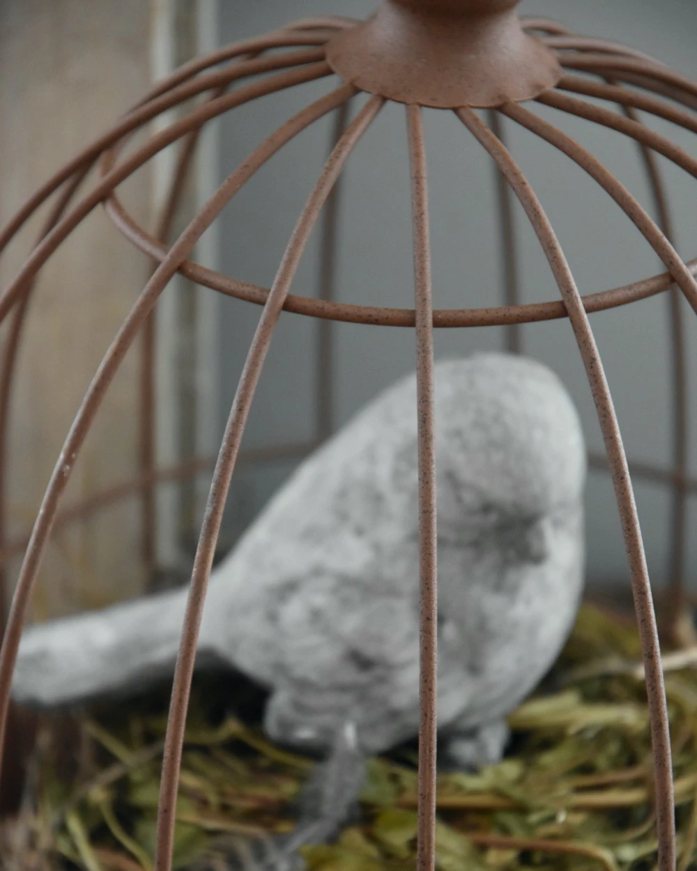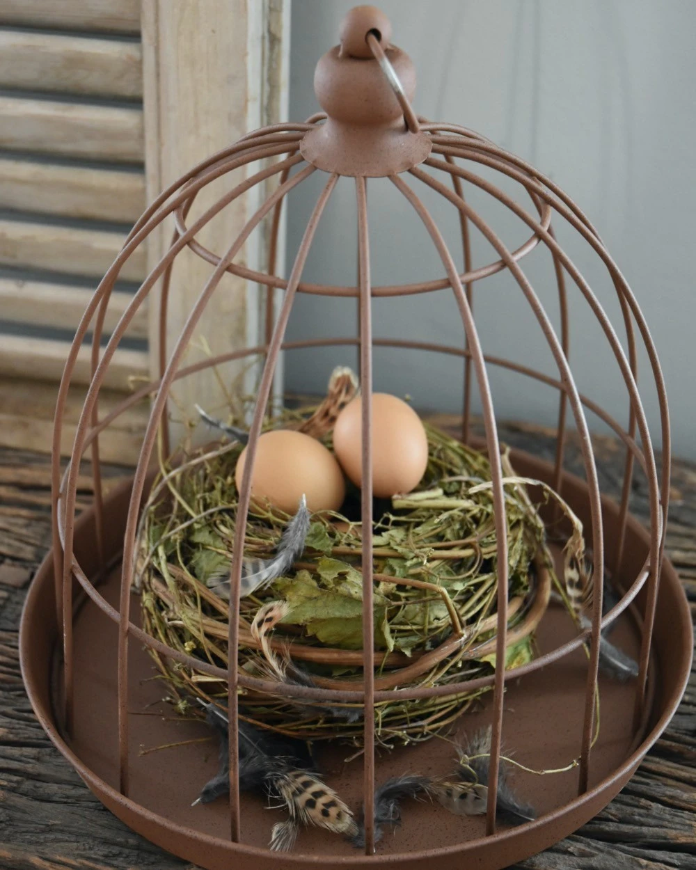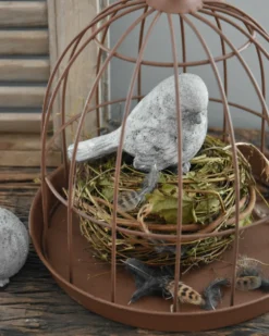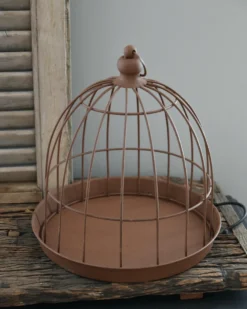 Grote metalen draad stolp. Deze leuke stolp heeft een ‘roest’ bruine kleur en is in een rond model. De stolp staat los op het blad met hoge rand waarmee u kunt er naar lust mee decoreren. Zo is het leuk om een mooi voorjaars- tafereel, met eitjes, vogeltjes en veertjes te creëren of met droogbloemen een stukje, wat grote lossen kunstbloemen, of een mooi voorwerp, wat oud servies……..