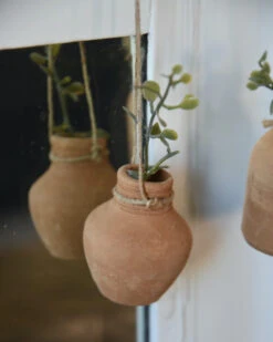 Handgemaakte aardewerk flesjes met ophang touw set van 3, IB Laursen. Deze leuke handgemaakte flesjes van rood stenen aardewerk zijn een set van drie en hebben elk hun eigen modelletje. Iedere flesje heeft een touwtje/koordje waarmee hij eventueel kan worden opgehangen aan een leuk rekje, of worden neergezet op een leuk plateau of in een vetplanten bakje… De flesjes zijn met de hand gemaakt en daardoor uniek in uiterlijk, de flesjes zijn niet waterdicht en exclusief inhoud (takjes groen).