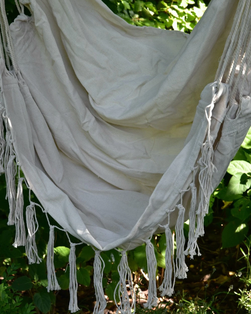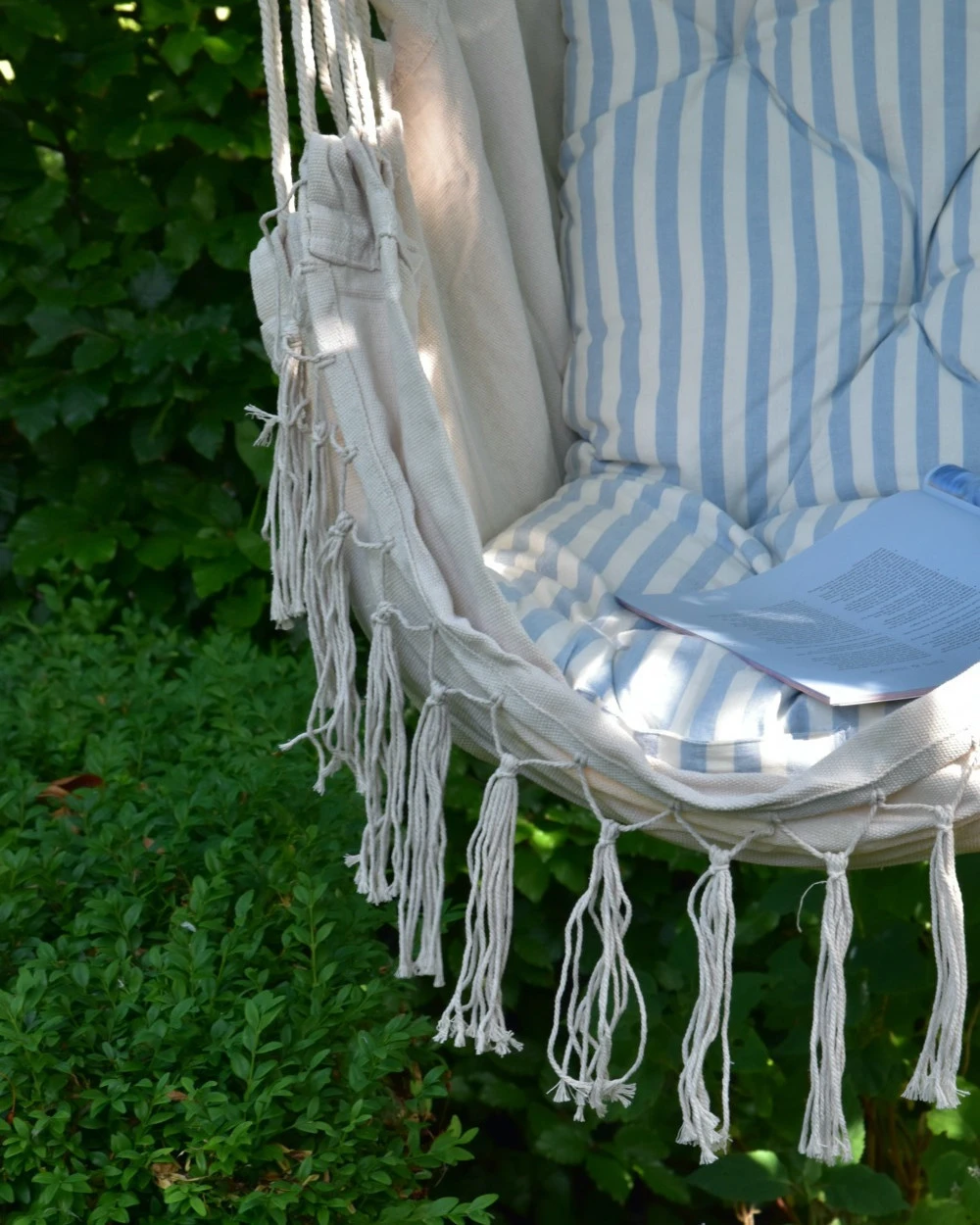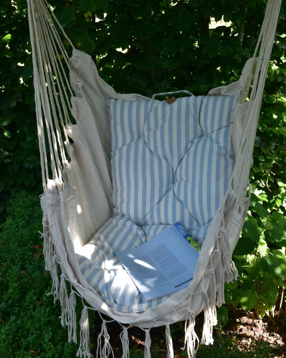 Hangstoel met kwastjes, IB Laursen. Deze leuke hangstoel van een mooie naturel stof heeft een kwastjes rand aan de onderzijde, een naturel houten stok met dik touw als hanger en een heerlijke zitting met hoge rug. De stoel kunt u een leuk plekje geven in huis, op de veranda of in de tuin bijvoorbeeld. U kunt zo in de stoel zitten of er bv een mooi matras kussen in plaatsen voor extra comfort. Een heerlijke stoel om in te wiegen, een boek te lezen en te genieten van rust….. Aan de bovenkant zit een dik touw met een lus erin zodat u hem gemakkelijk kunt ophangen.