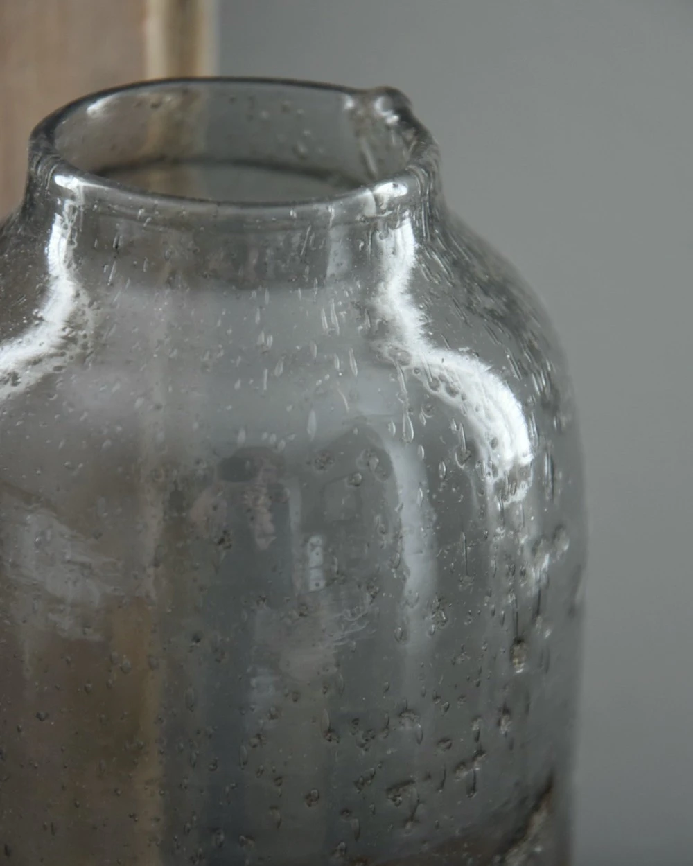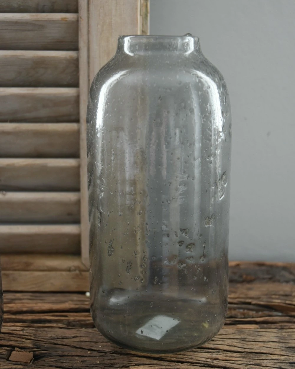 Hoge vaas met bubbels, zilvermetaal en grijze gloed per stuk. Deze leuke glazen vaas heeft een recht opgaand hoog model met een afgeronde iets smallere hals. Het glas is transparant met een grijze gloed en een mooi effect van bubbels en zilvermetaal in het glas verwerkt. De vaas staat heel mooi met enkele takken of droogbloemen die leuk te combineren zijn met wat schelpen en takjes op de bodem van de vaas.
