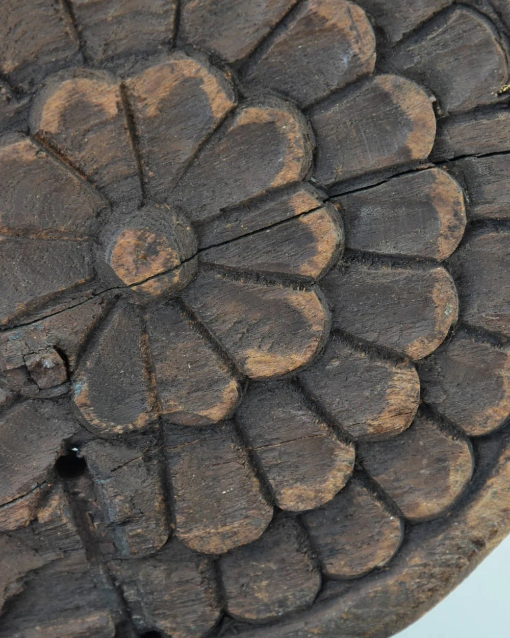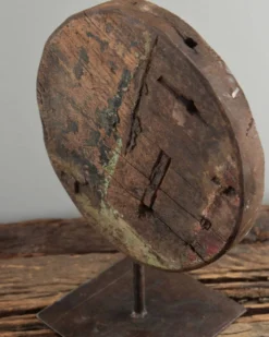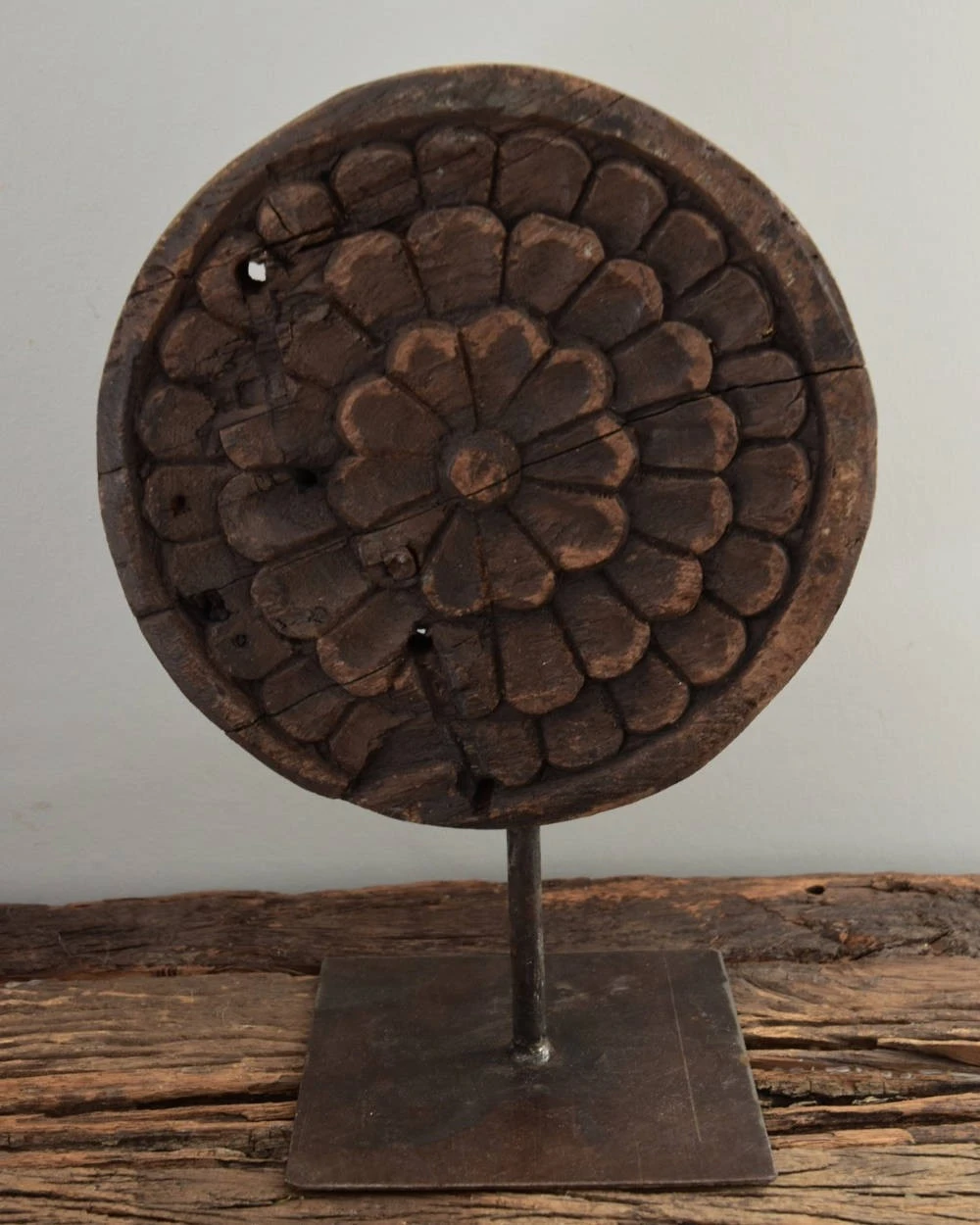 Houtsnijwerk decoratie cirkel bloem op statief. Dit prachtige unieke houtsnijwerk van een bloem is naturel van kleur en staat op een metalen statief. Het houtsnijwerk is oud en daardoor niet overal het zelfde wat veel sfeer geeft en een uniek uitstalling.