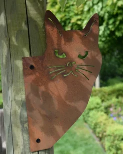 Kat hoekjes gluurder, metalen tuin decoratie. Deze leuke kattenkop komt zo om de hoek gluren. De metalen silhouet kat heeft een mooi roestlaag en kan aan de paal van de schutting op van het schuurtje worden geschroefd zodat hij altijd gezellig mee kan gluren….. Er zijn twee gaatjes aanwezig zodat u er gemakkelijk een schroef/spijker in kunt zetten, er zijn geen schroeven meegeleverd. U kunt de kat zowel naar links als rechts om de hoek laten kijken.