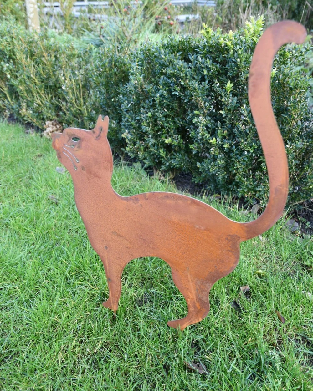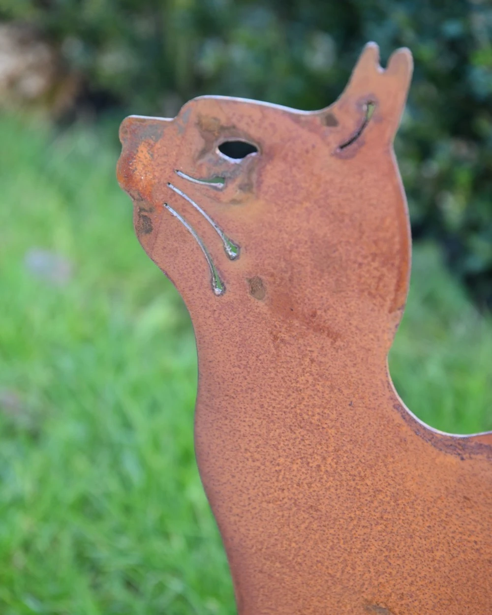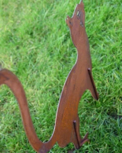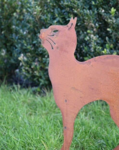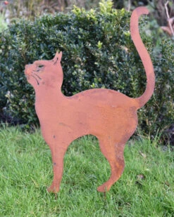 Kat met hoge rug op tuinprikker. Deze 2D kat in van metaal gemaakt die door een speciale behandeling een mooie roestlaag heeft gekregen. De leuke vorm van de kat met een hoge rug en een lange staart naar boven heeft ook snorharen en een oog. Er zijn twee prikker aan de poten bevestigd zodat u de kat zo in de grond kunt prikken op een plek in de tuin waar u het meest van geniet.
