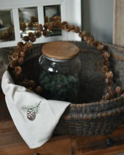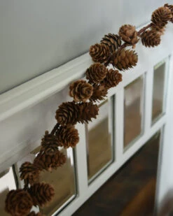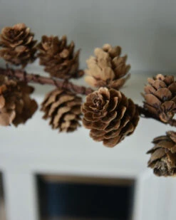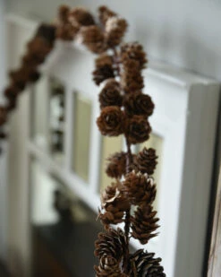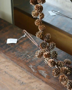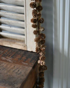 Kegel guirlande van Omerica kegeltjes, IB Laursen. Deze lange guirlande of dennenappel toef is van naturel Omerica kegeltjes. Aan een uiteinde zit een grote lus waarmee u de kegels kunt ophangen. De basis van de hanger is vrij stug waardoor hij gemakkelijk in een mooie sierlijk boog kan blijven en gemakkelijk tot een krans worden gedraaid, zoals u ook in de mand ziet. Het is ook erg leuk om hem recht naar beneden te hangen aan de deur of kast bijvoorbeeld.