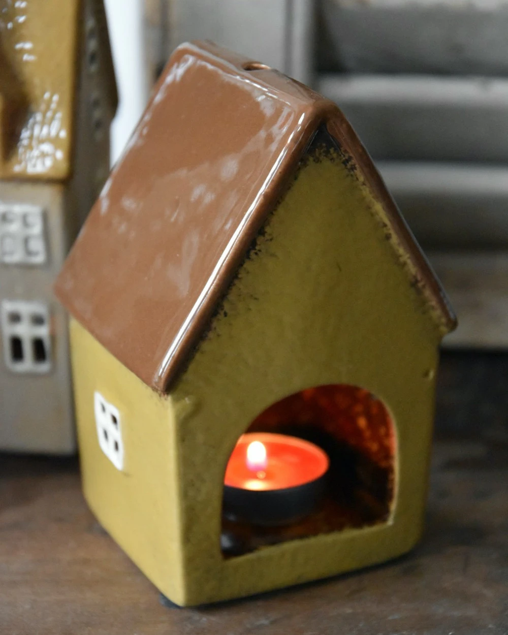 Keramiek theelicht huisje Nyhavn, IB Laursen. Dit leuke theelicht huisje van keramiek is in een lichte mos groenige tint met een bruin dak. Het huisje heeft open ramen en via de achterzijde kan er een waxinelichtje in worden geplaatst zodat er door alle open ramen een mooi schijnsel komt. U kunt de huisjes mooi met elkaar combineren en zo uw eigen dorp creëren. De huisjes zijn van het Deense merk IB Laursen en zijn geïnspireerd naar het havenplaatsje Nyhavn met al zijn mooie kleurvolle pakhuizen.