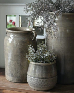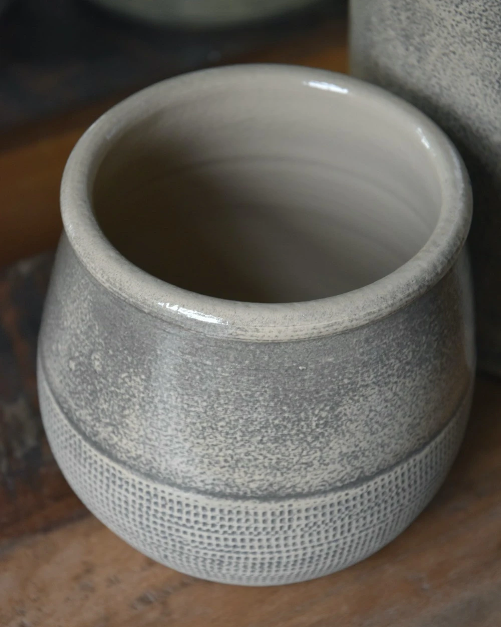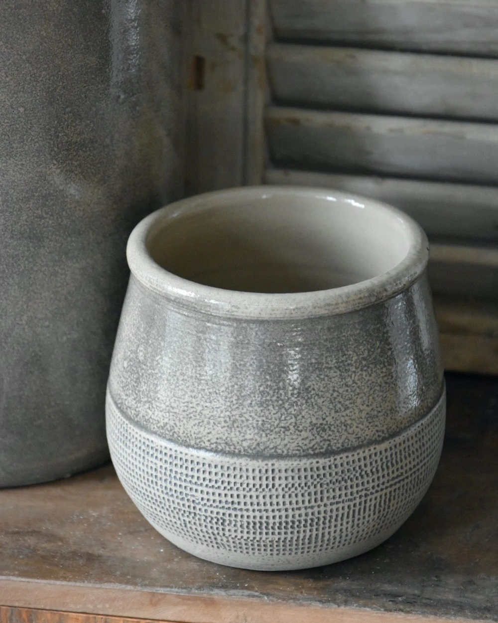 Klei grijze pot iets bol met gewerkte onderrand, IB Laursen. Deze prachtige pot van een hoge kwaliteit heeft een aardse klei grijze tint die iets gemêleerd is, waardoor hij erg goed en gemakkelijk mee kleurt in de omgeving. De pot is iets bol en taps, de bollere onderrand is mooi gewerkt waardoor er een fijn patroon ontstaat en de bovenrand is iets bol. De pot past perfect bij de pot kruik met de oren. U kunt de pot als planter gebruiken met een mooie ‘kunst’ plant bijvoorbeeld. De pot is niet 100% waterdicht, wij adviseren om altijd een binnenvaas of plastic te gebruiken wanneer u er levende planten of bloemen in zet.