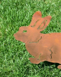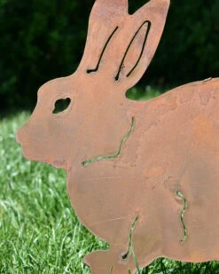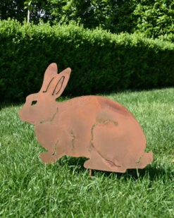 Konijn van roest metaal als tuinsteker. Dit leuke konijn van metaal die door een speciale behandeling een mooie roestlaag heeft kunt u zo in de tuin/gras prikken. Zo kunt u op elke gewenste plek een konijn in uw tuin zetten. Het mooie silhouet geeft het konijn goed weer en geeft een mooi effect.