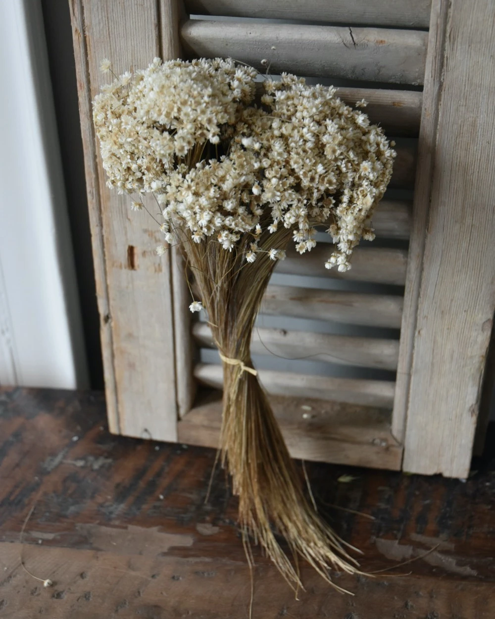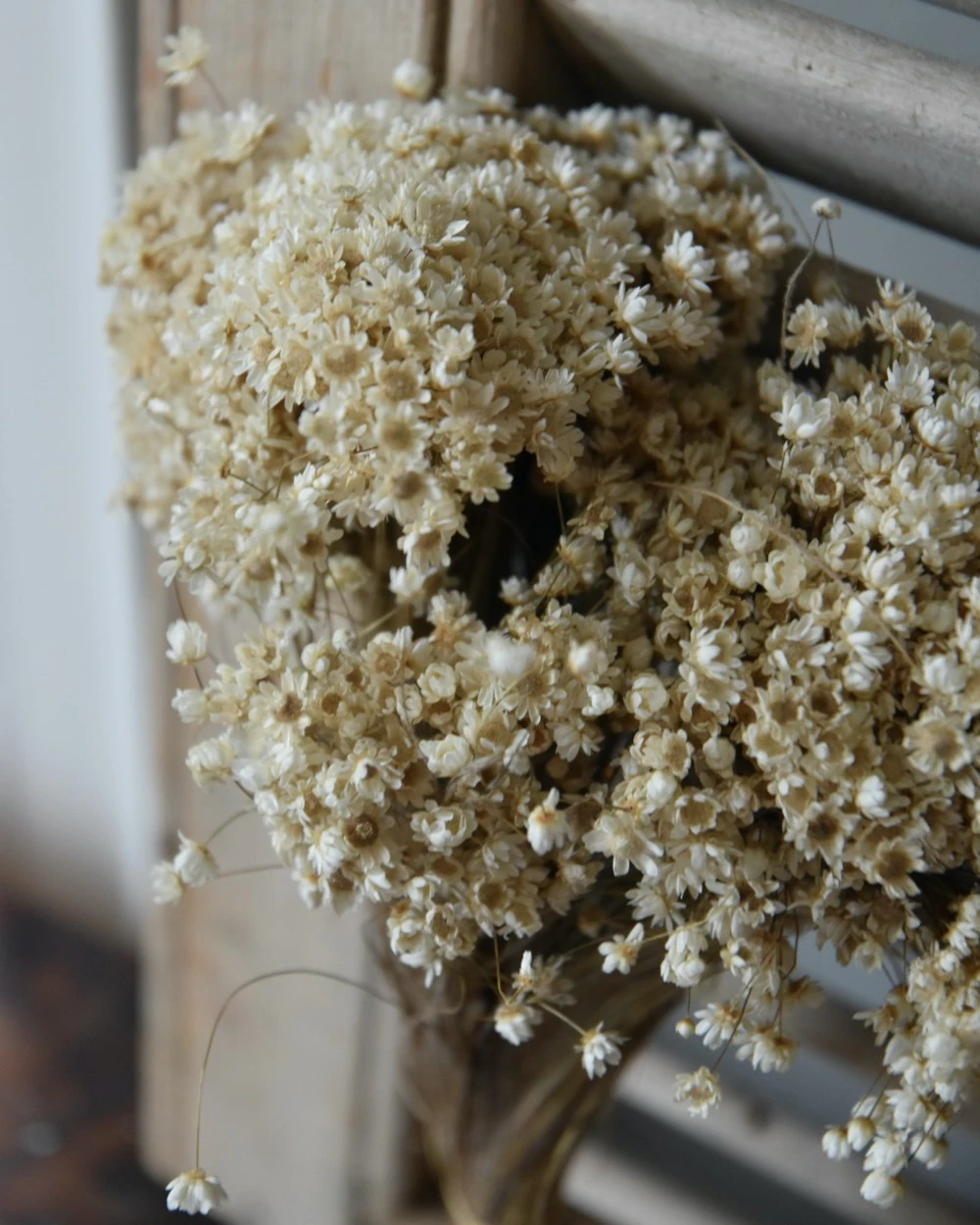Marcela droogbloemetjes in naturel wit. Deze schattige kleine droogbloemetjes zijn in het naturel wit. De bloemetjes zitten elk op een dun steeltje en vormen samen een mooie bos. U kunt de bloemetjes leuk neerleggen op een plateau met andere leuke potten en items. ze samenbinden en onder een stolp zetten bv of in hele kleine fles vaasjes zetten…