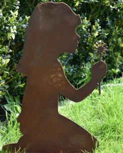 Meisje met Paardebloem ecoroest tuindecoratie. Deze leuke tuindecoratie van een meisje die tegen een paardenbloem blaast is als silhouet van ecoroest. Het meisje zit op haar knieën welke op een ovaal plaatje zit zodat u hem zo neer kunt zetten in de tuin of op het gazon bijvoorbeeld. Er is altijd wel een mooi plekje te vinden in de tuin waar dit lieve meisje mag zitten……