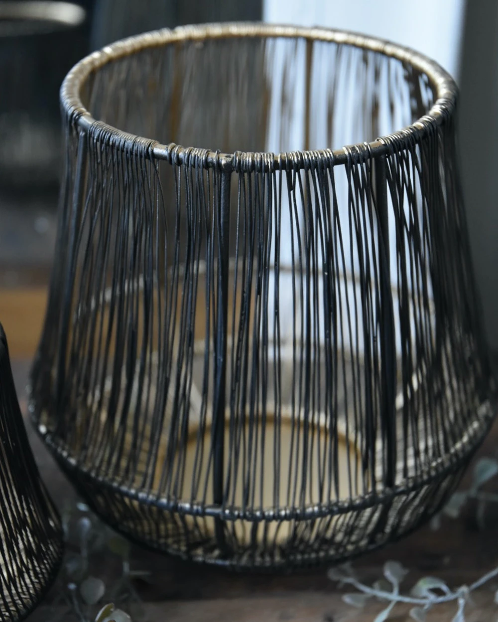 Metalen draad windlicht zwart goud groot. Dit prachtige windlicht van metaal heeft een elegant model en is met draad gevormd. De buitenkant is zwart en van binnen is het windlicht goud wat een mooi warm effect geeft wanneer er een kaars in gebrand wordt. U kunt is het windlicht een normale stompkaars zetten en door het draad effect komt het licht heel mooi vrij. (er zit geen windglas in)