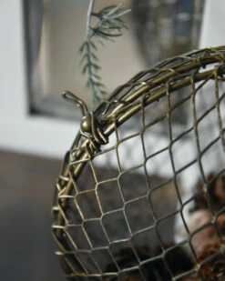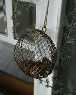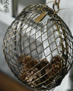 Metalen draadbal antiek look vulbaar, IB Laursen. Deze leuke bal van antiek look kleurig metaal draad is hol en kan open met de sluiting, zodat u hem eventueel kan villen met dennenappels, kerstballen, gedroogde vruchtjes, groen of droogbloemen…. bijvoorbeeld. De bal zit aan een lange jute lus waarmee u hem eventueel kunt ophangen voor het raam, aan de kast, keukenrekje, of in een krans bijvoorbeeld. Ook staat de bal leuk op een plateau met andere items…. Ook is deze bal leuk met een vetbol voor de vogels (gaat wel roesten buiten)