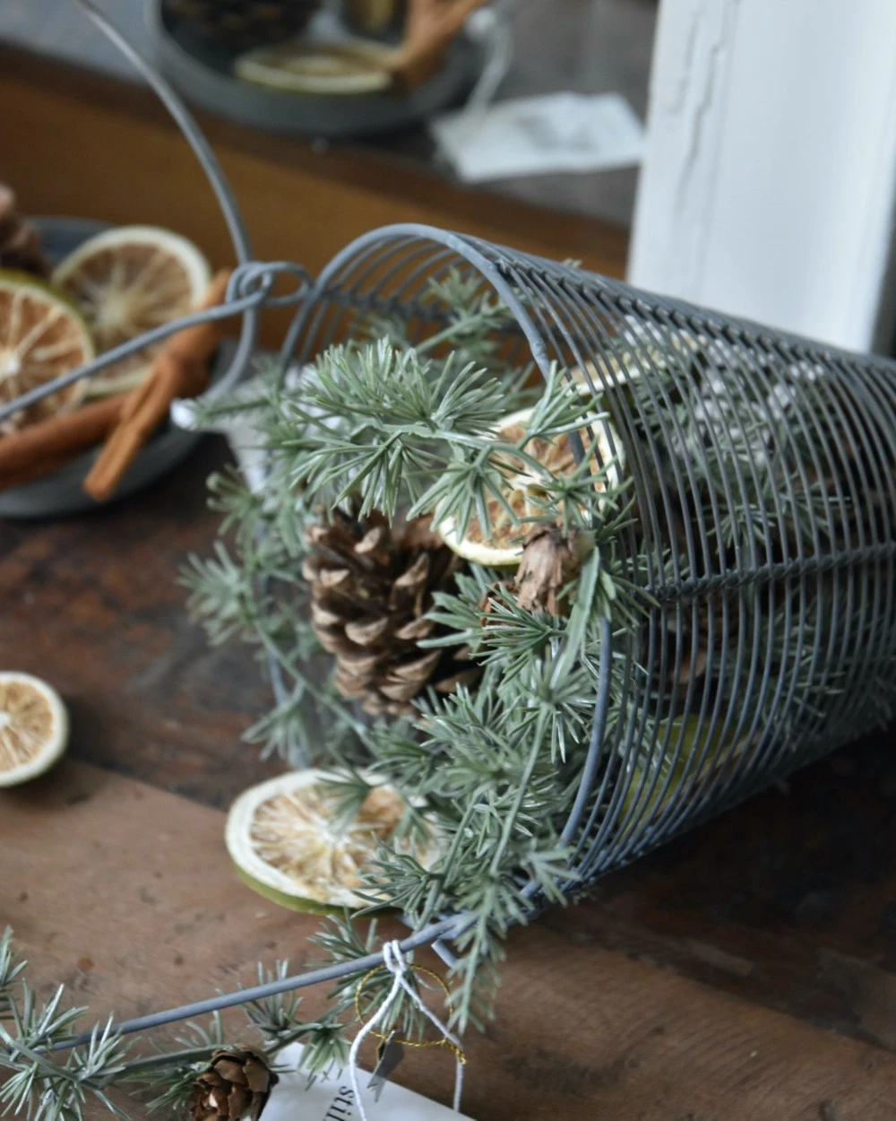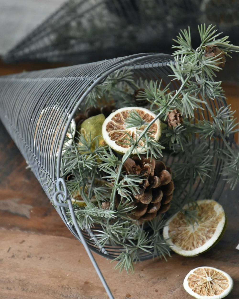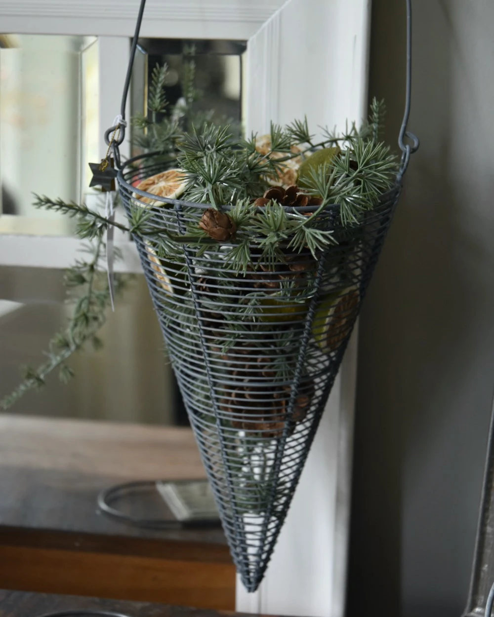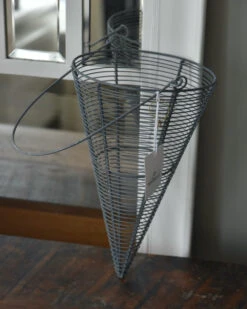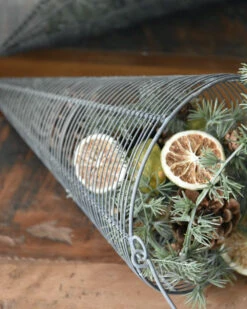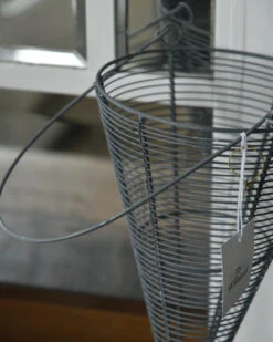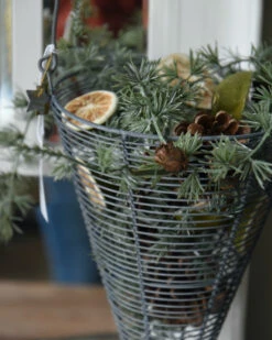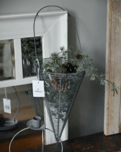 Metalen draadmand horizontaal in punt met hengsel zink grijs, IB laursen. Deze leuke draadmand kegel heeft een groot hengsel en het metalen draad heeft een zink grijze look afwerking. Het draad is horizontaal opgespannen wat een mooi effect geeft. U kunt de mand vullen met bv dennenappel, groen, mos, kerstballen, lichtjes, uien……. zodat ieder seizoen of soort gebruikt mooi benadrukt wordt.