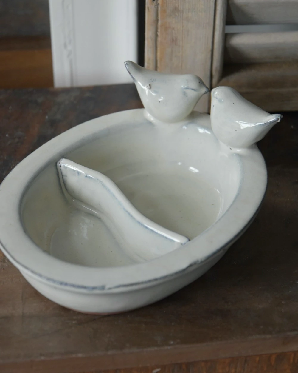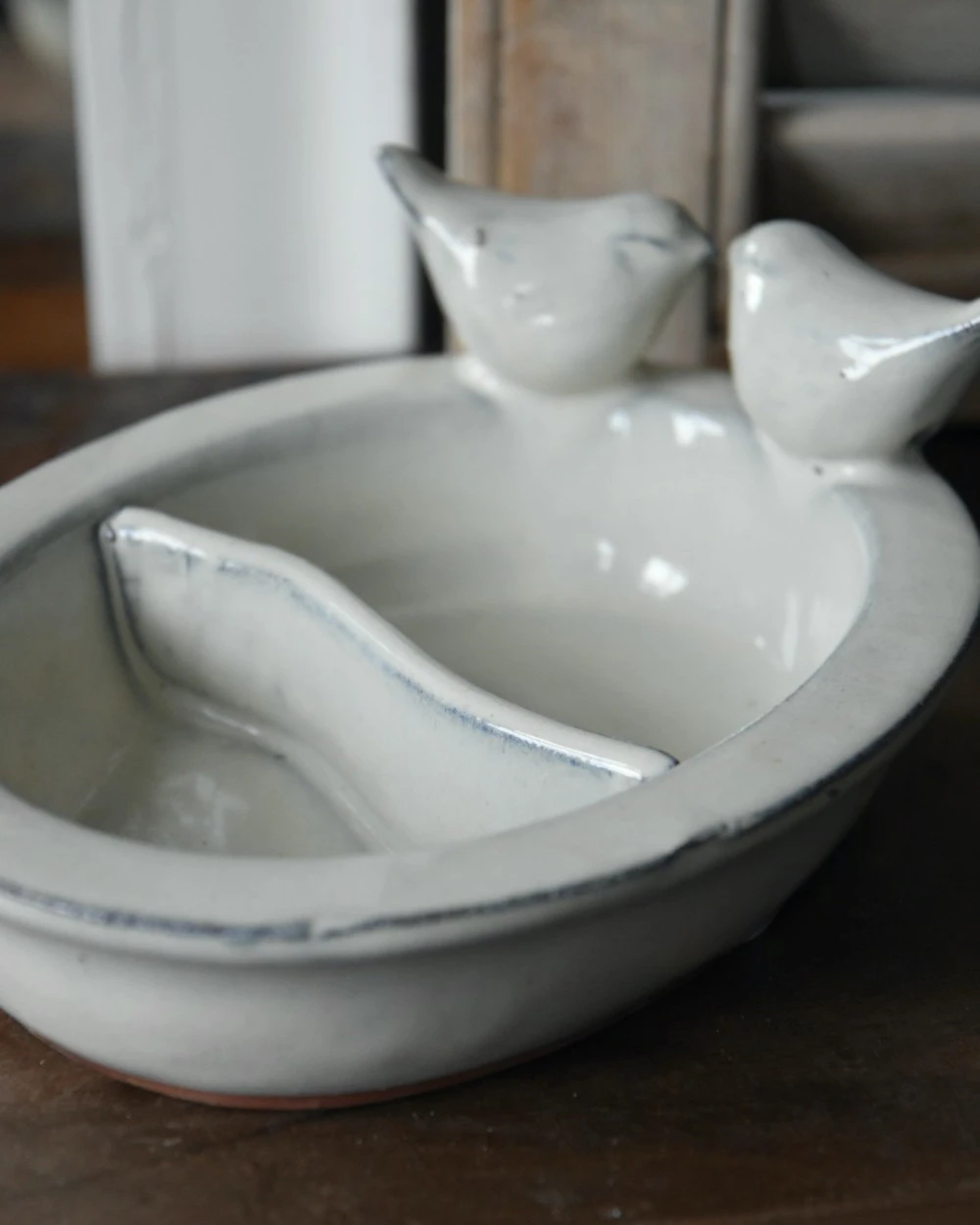 Ovalen vogel voeder/drink schaal met twee vogeltjes. Deze leuke schaal van room kleurig keramiek is ovaal en heeft twee vogeltjes op de rand en de schaal heeft een tussenschot, zodat er twee gedeelten ontstaan. U kunt de schaal als vogel drinkbak in de tuin gebruiken of met los voer (zet hem dan met regen overdekt neer zodat het niet nat wordt).