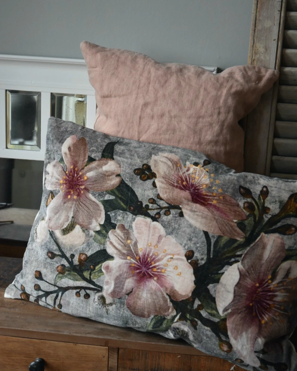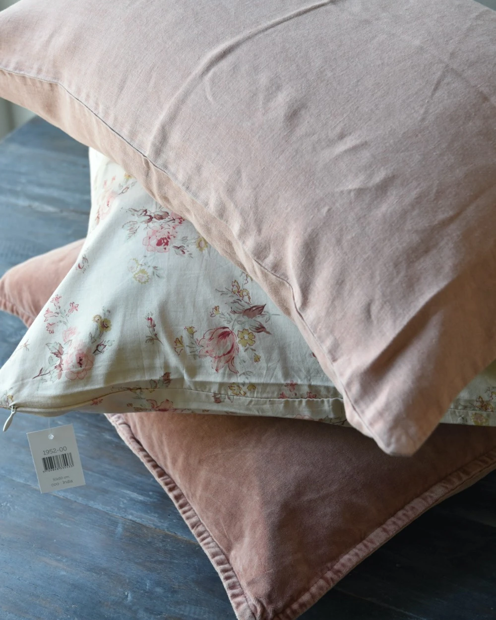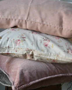 De mooie tinten pastel roze kunnen goed worden gecombineerd met de bloemenprints(foto 2, 3, 5, 6, 8, 9), en dan ook weer samen met voor een iets donkerdere tint rust (foto 7 de donkerste tint rechts) en voor een beetje meer pit met de faded rose hoezen in linnen en velours (foto 7 bovenop).