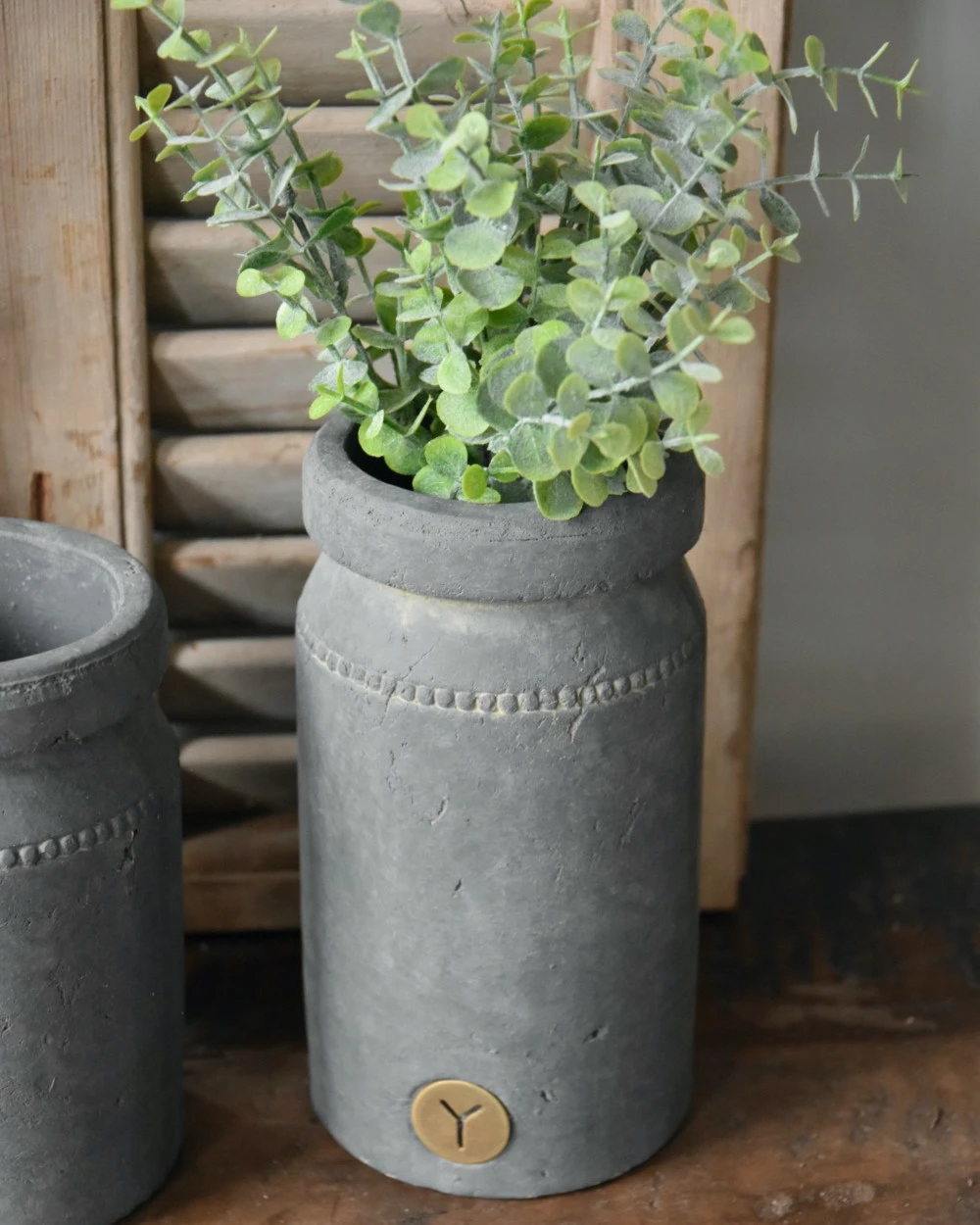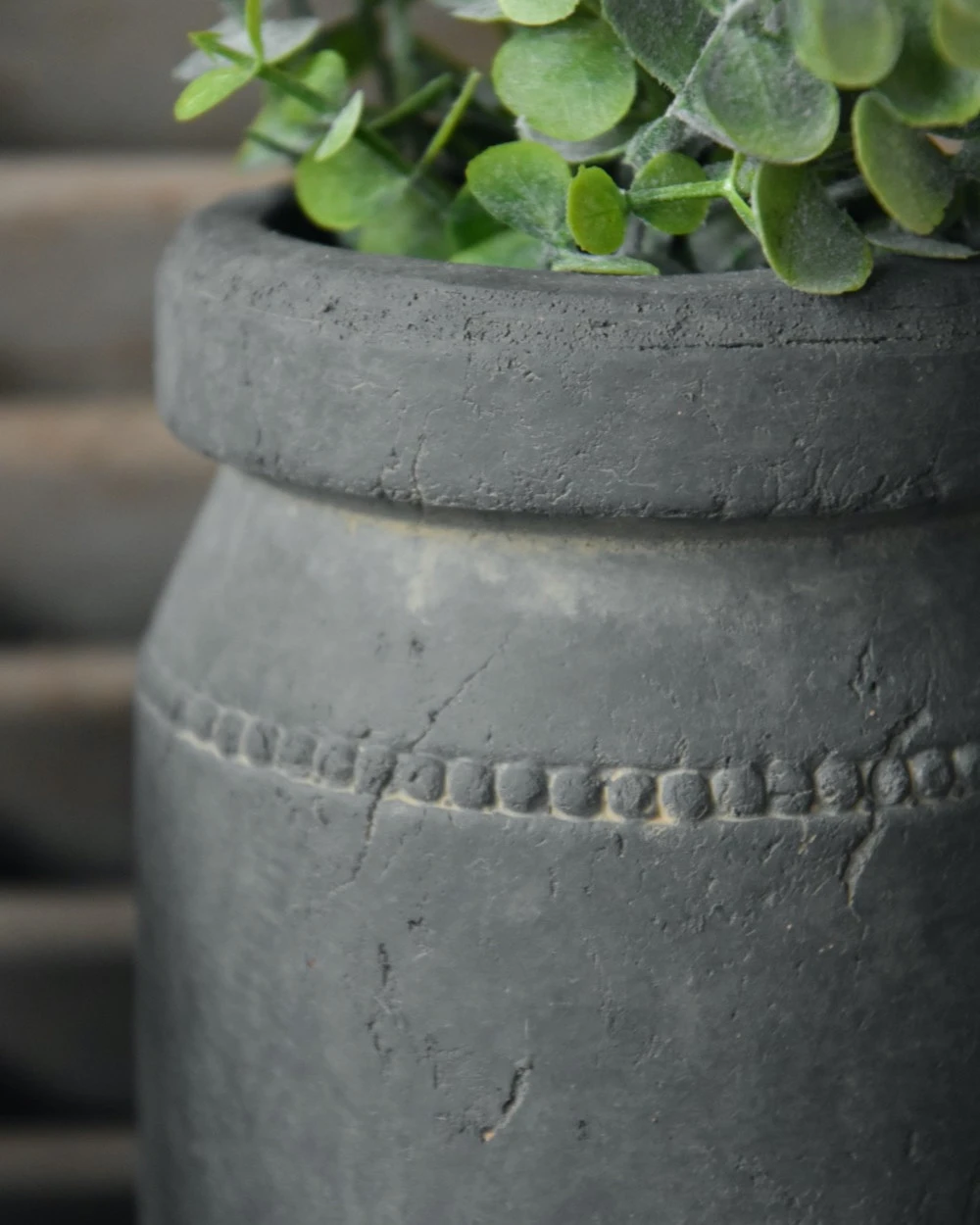 Pot aardewerk Majestic grijs met sierrandje en kraag L, Brynxz. Deze hoge pot van aardewerk is rond en heeft een recht opgaand model met een sierlijk gebobbeld randje en een brede kraag. Aan de voorzijde zit het Brynxz logo verwerkt en de pot is in meerdere maten/hoogtes verkrijgbaar (zolang de voorrad strekt). U kunt de pot heel goed ook mixen met de Majestic serie van Brynxz, waarvan heel veel kandelaren, leuke accessoires, kunst planten en kaarsen te verkrijgen zijn…