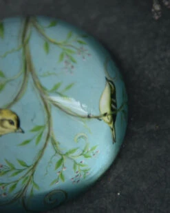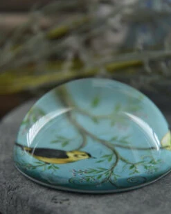 Presse papier met vogels op tak in pastel blauw per stuk. Deze prachtige brocante halve glazen bol heeft een mooie pastel kleurige afbeelding van vogels in een tak. De zware decoratieve bol kan heel goed worden gebruikt om papier bv op zijn plek te houden, maar staat ook prachtig op een bijzettafeltje of in de boekenkast.