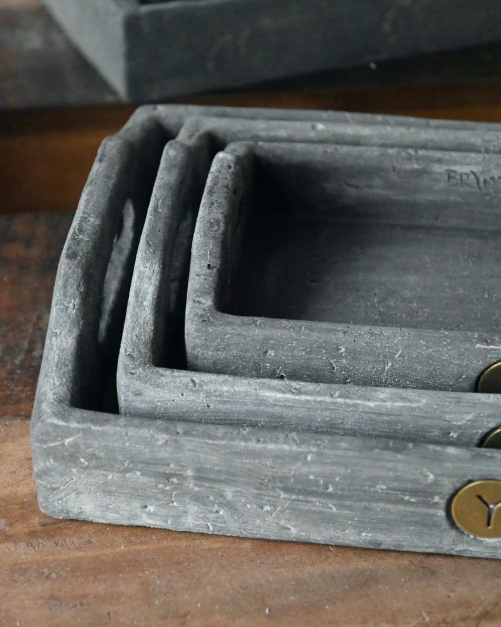 Rechthoekige tray met handvaten middel, Vintage Brynxz. Deze mooie tray in dienblad model is van zwaar aardewerk en heeft een vintage grijze afwerking. De tray heeft twee handvaten en aan de voorzijde zit het Brynxz logo in de rand verwerkt. De tray is plat met rechtopstaande randen zodat u er gemakkelijk alle kanten mee op kan en hem gezellig kunt opmaken met wat mooie potjes, kaarsen en kleine decoraties bijvoorbeeld. Het blad is (zolang de voorraad strekt) in 3 maten verkrijgbaar waarvan deze het middelste formaat is.
