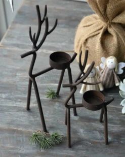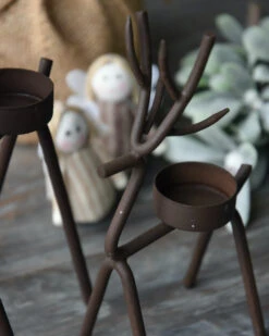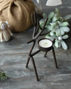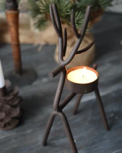 Rendier theelicht van metaal middel,, IB Laursen. Deze leuke waxinelicht houder is in model van een hert/rendier. De waxinelicht houder is gemaakt van een metalen frame in model van een hert/rendier met een waxinelicht inzet op de rug. Dit model is in twee maten verkrijgbaar en past goed bij de boom en kegel kandelaar, de Mistletoe en de ster kandelaar. Verder kan hij heel mooi worden gecombineerd met alle houten materialen en natuurlijke tinten bijvoorbeeld.