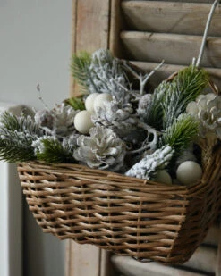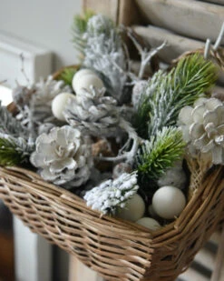 Rieten mand gevuld met besneeuwd groen en witte dennenappels. Deze leuke rieten mand heeft twee hengsels waarmee hij eventueel kan worden opgehangen. De mand is gevuld met besneeuwd kerstgroen, jute, witte kerstballetjes en witte Dennenappels. Het groen is kunst/zijde de dennenappels en de tak zijn gedroogd en wit gemaakt. U kunt de gevulde mand zo neerzetten of opgangen aan het keukenrekje of een haak bijvoorbeeld. Alles in de mand is mooi geschikt, maar kan er ook weer gemakkelijk worden uitgehaald om de mand om te toveren in een andere sfeer die in het seizoen past bijvoorbeeld.