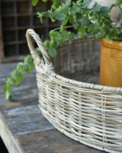 Rond grijzig rotan dienblad met hengsels, IB Laursen. Dit leuke dienblad van grijzig rotan is rond met een hoge opstaande rechte rand en twee hendels/handvaten. Het leuke model is makkelijk te combineren door de neutrale kleur en kan op veel manieren worden gebruikt of gedecoreerd. Zo is hij in de keuken met servies op de aanrecht of de tafel leuk. In de woonkamer met een mooie ballonvaas en wat kaarsen, met de kerst met wat boompjes en ballen………..