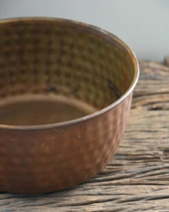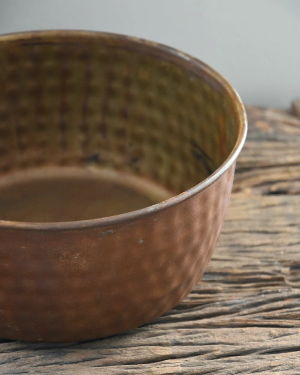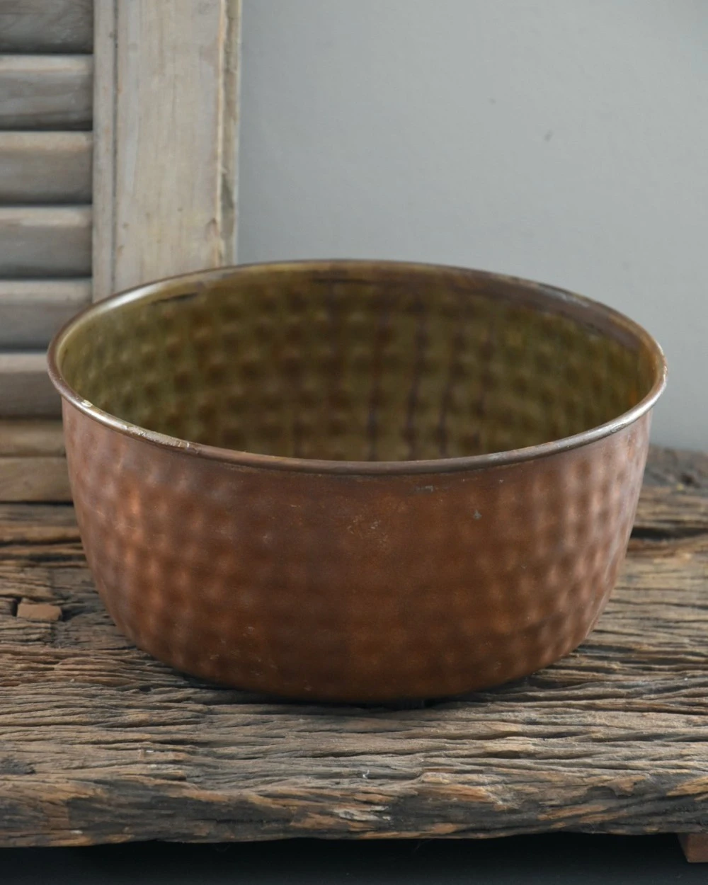 Rond metalen schaal met ‘bobbel’ structuur, groot per stuk. Deze prachtige schaal heeft een mooie verouderde look, door de afwerking en het gebruik van een (roest) buitenkant en een verouderde vage goud tint aan de binnenkant. De schaal heeft een mooie ‘bobbel’ structuur van rondingen over de gehele rand van de schaal die hoog naar boven loopt.