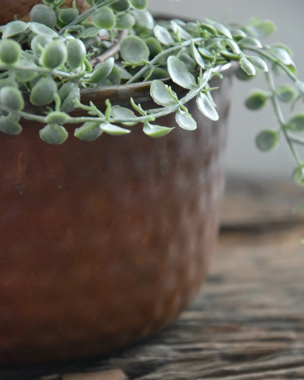 Rond metalen schaal met ‘bobbel’ structuur, klein per stuk. Deze prachtige schaal heeft een mooie verouderde look in warme tinten, door de afwerking en het gebruik van een (roest) buitenkant en een verouderde vage goud tint aan de binnenkant. De schaal heeft een mooie ‘bobbel’ structuur van rondingen over de gehele rand van de schaal die hoog naar boven loopt.