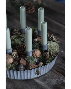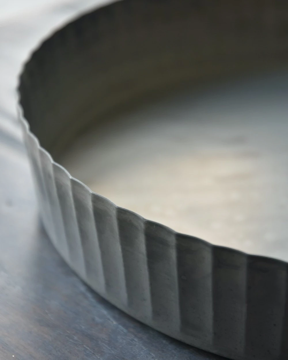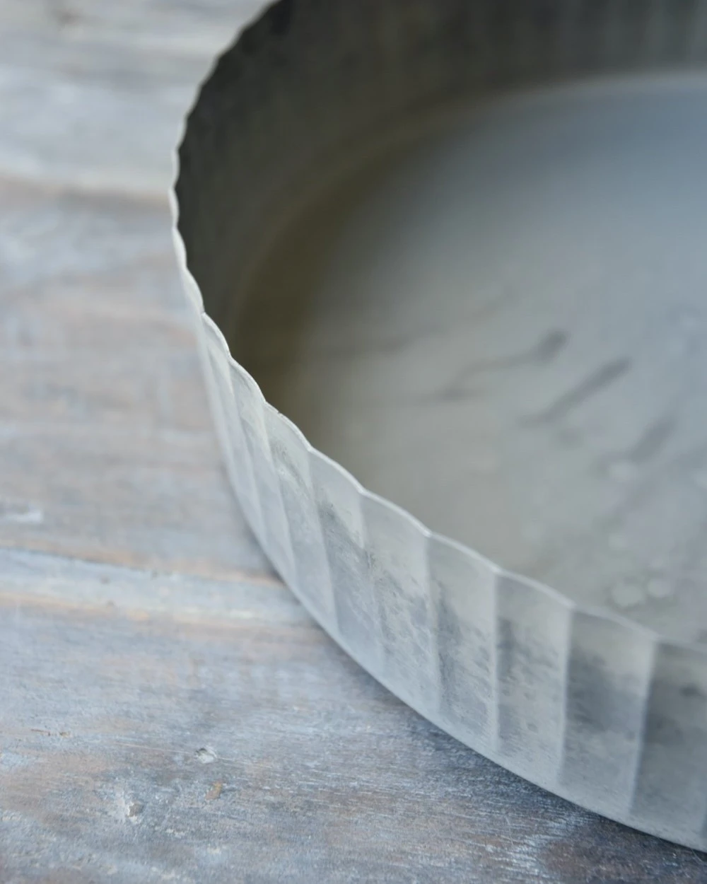 Ronde zinken schaal met hoge schulp rand, IB Laursen. Deze grote ronde schaal heeft platte bodem, een mooie hoge schulp rand en is in het zink grijs. De schaal past eigelijk overal bij en kan op heel veel manieren worden gedecoreerd. Zo kunt u hem als kaarsen plateau gebruiken, met potjes en kandelaren, Met vetplanten en schelpen, met mooie gedroogde vruchten en een groene rank, met kerstballen,………