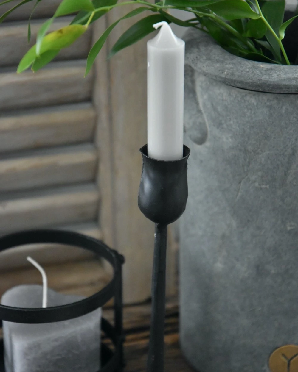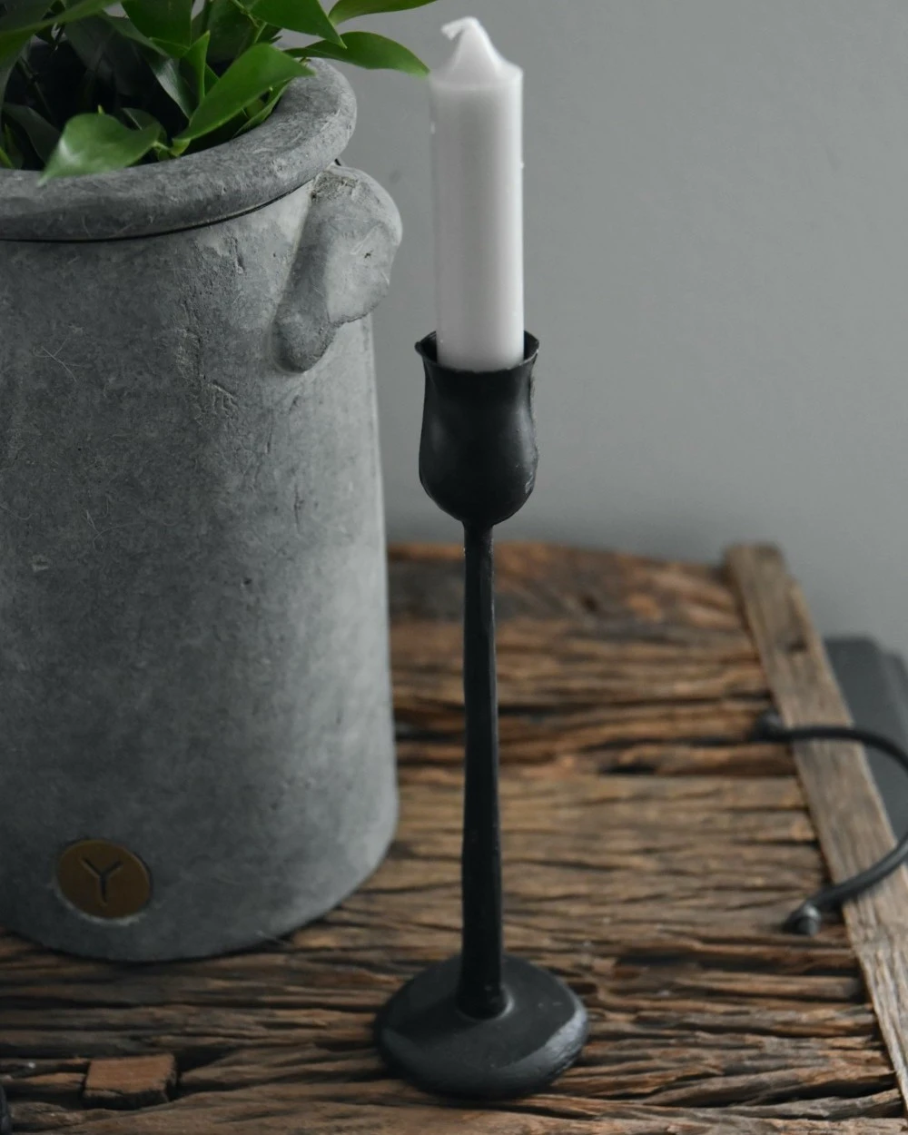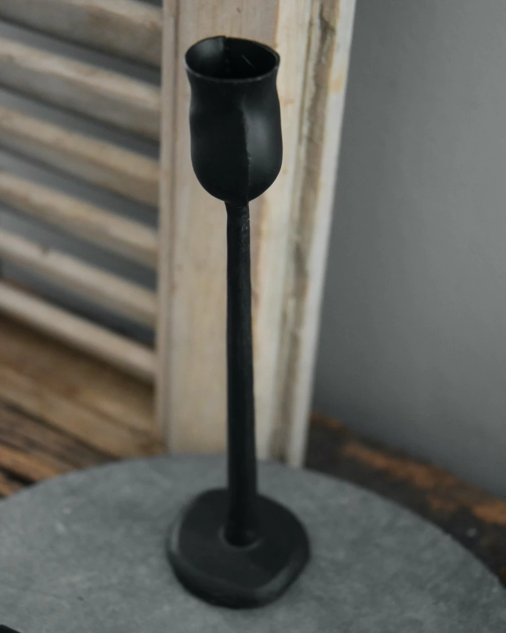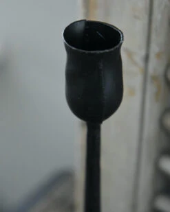 Smeedijzeren kandelaar zwart, Brynxz per stuk. Deze handgemaakte kandelaar heeft een prachtig model met een mooie gebolde kaarseninzet. De de kaarseninzet, lange poot en de voet met ieder zijn eigen vorm is elk uniek door het mooie vakwerk. In de kaarseninzet zit wat dieper een iets smallere gedeelte zodat er gemakkelijk een normale kaars met iets verschil in diktes inpast. Door de zwarte kleur en het model is het een kandelaar die altijd kan en ook overal bij past, met een kleur kaars kunt u uw eigen sfeer creëren.