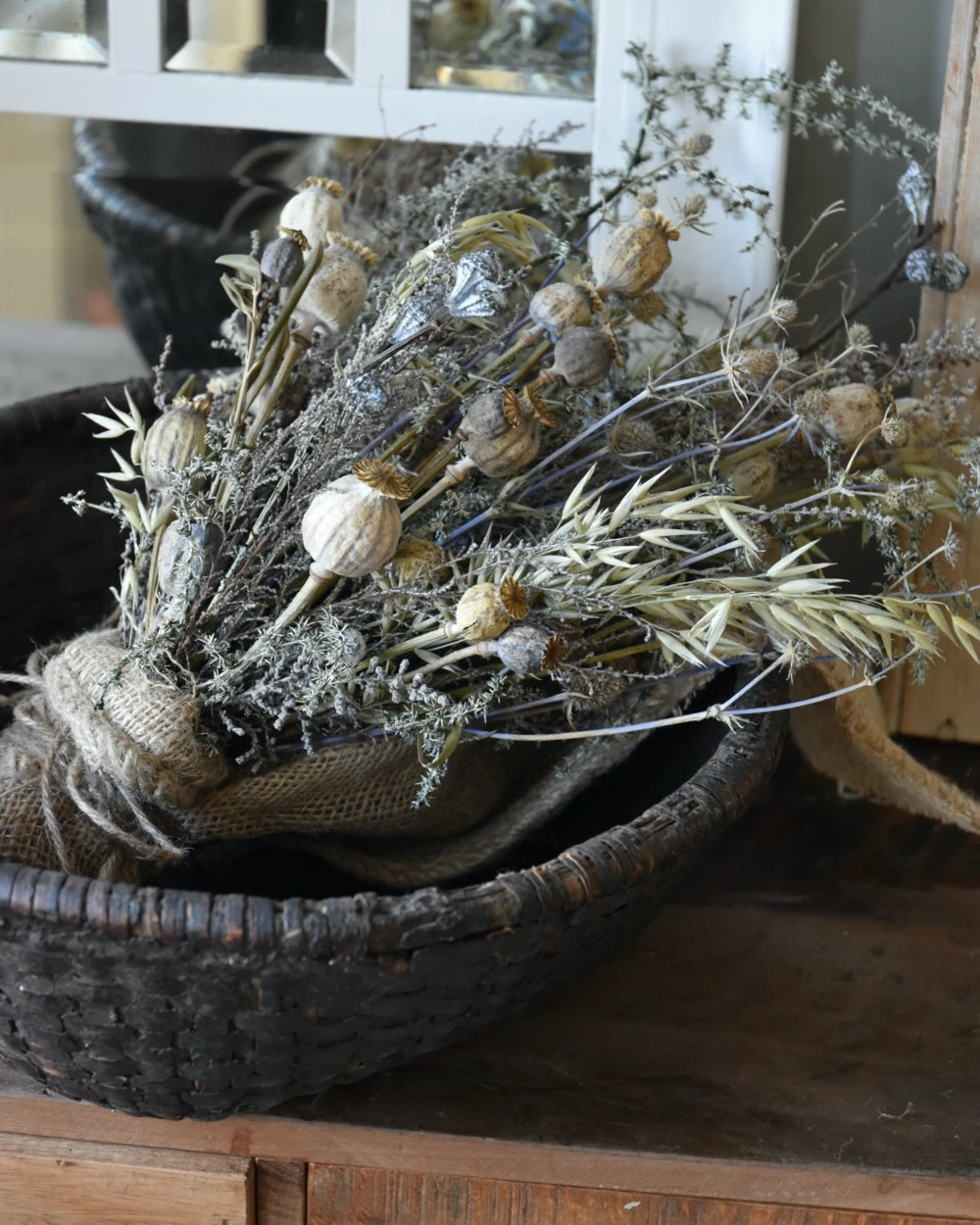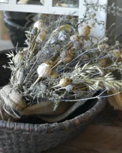Sobere droogbloem toef in oude leemmand. Deze prachtige oude leemmand compleet met een sobere droogbloemen toef in sobere woonstijl, kunt u zo neerzetten. De toef is opgemaakt met Wilde Asparagus, Papavers, Stoebe, Tijm, Haver, Disteltjes en Eucalyptus vruchten en afgewerkt met een grove jute lap. U kunt de mand op een mooi plekje op tafel of een lage kast zetten bijvoorbeeld. De prachtige leemmand is echt oud en laat dit in kleine gebreken zien waardoor het geheel vol karakter is.