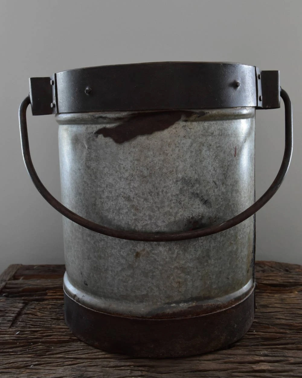 Stoere vintage emmer met hengsel, en unieke details. Zware kwaliteit met mooie veroudering als deukjes en verfspatten. Een prachtige aanwinst voor uw interieur. De emmer is zwaar en staat mooi met een olijfboompje of citrusboompje, of met wat takken bijvoorbeeld. Ook leuk om met de kerst een kleine kerstboom in te zetten.