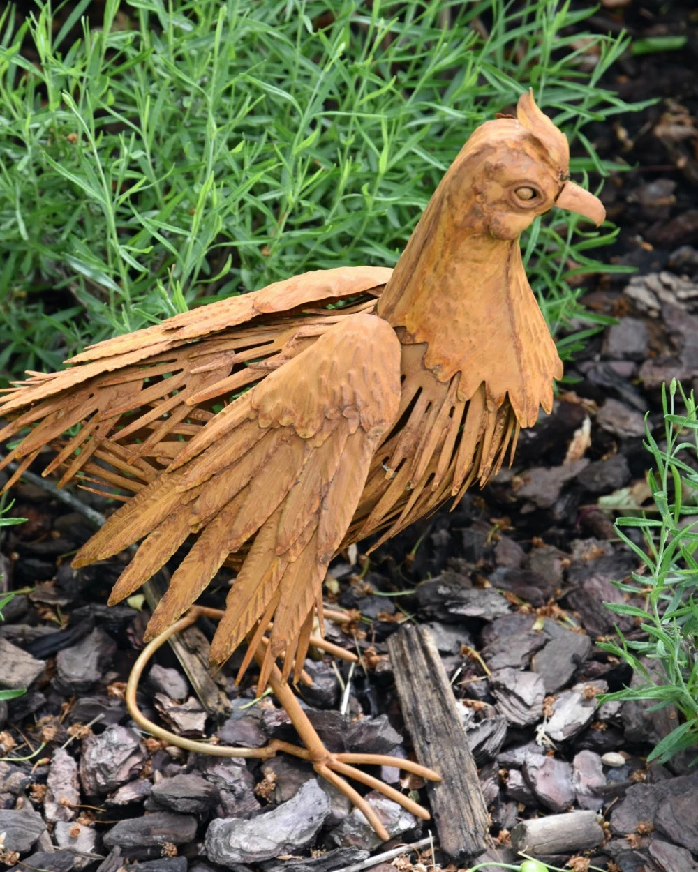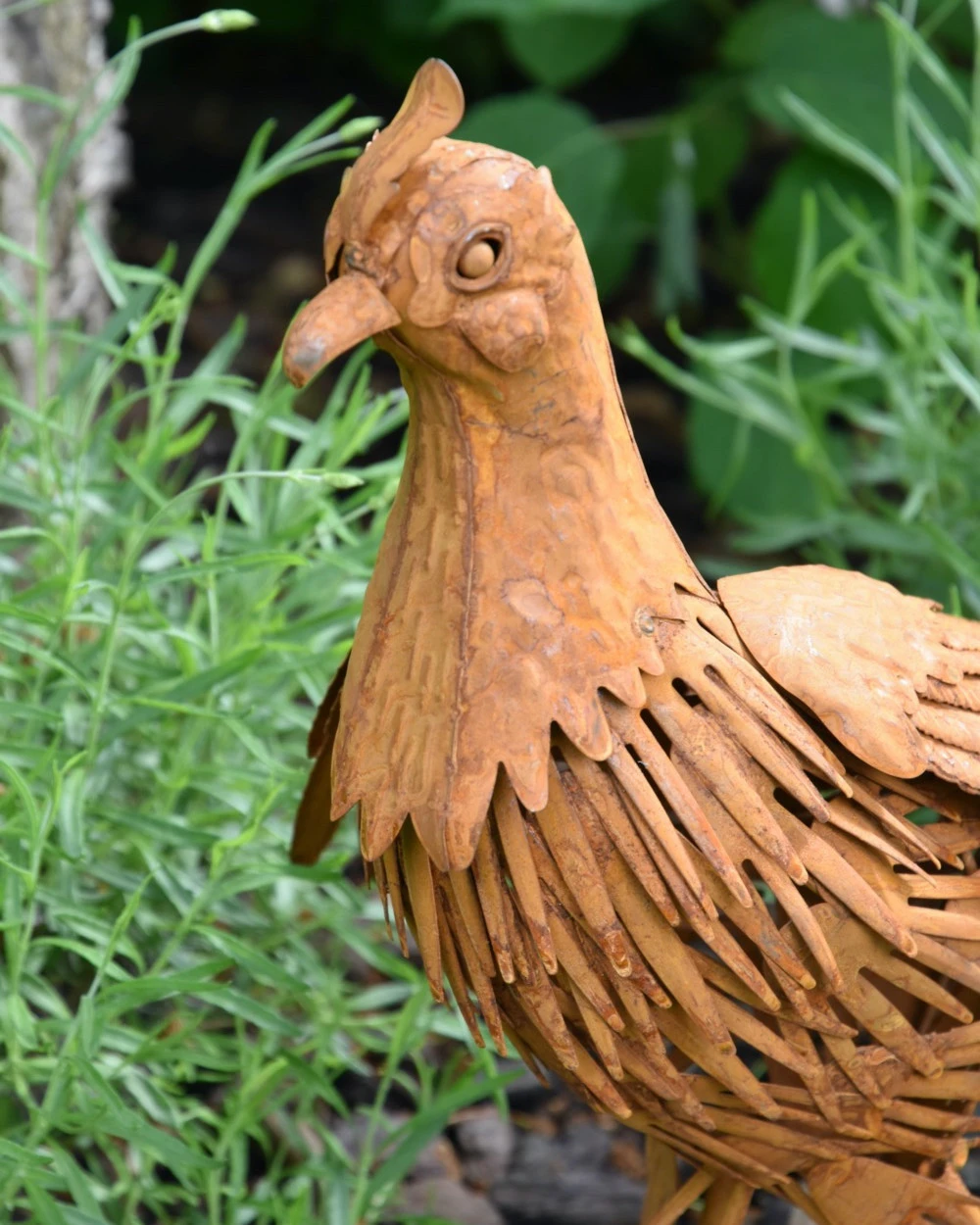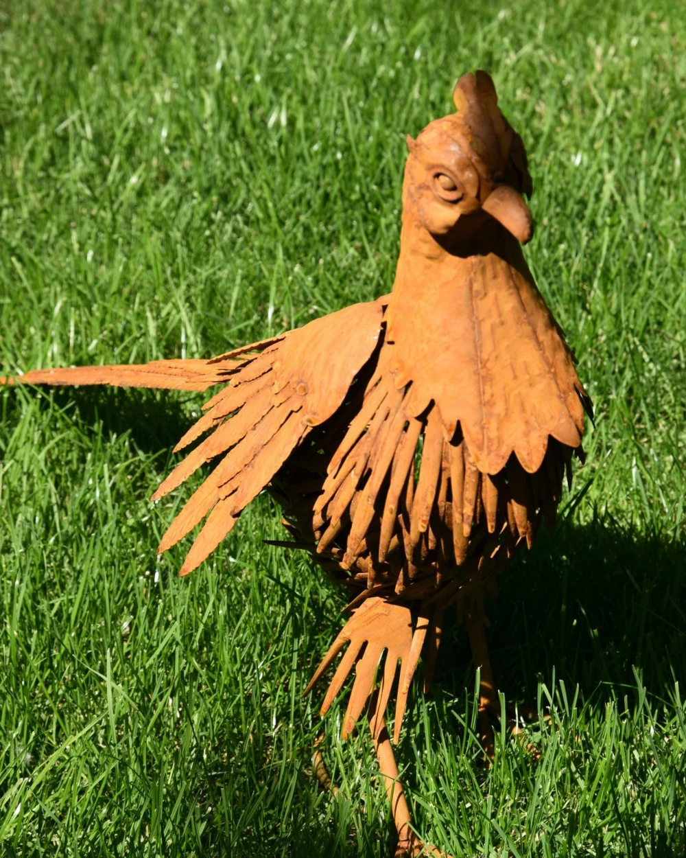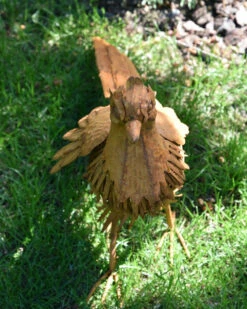 Tuinvogel in 3D de Fazant. Deze prachtige Fazant is van metaal en ‘blik’ gemaakt die dor een speciale behandeling een mooie roestlaag heeft gekregen. De mooie details in de vogel maken het zoals een Fazant, een parmantige indruk. De kop met zijn kuif, het verendek, de poten en de lange staart… U kunt de Fazant een mooi plekje in de tuin bv geven, om zo te genieten van deze gedaante.