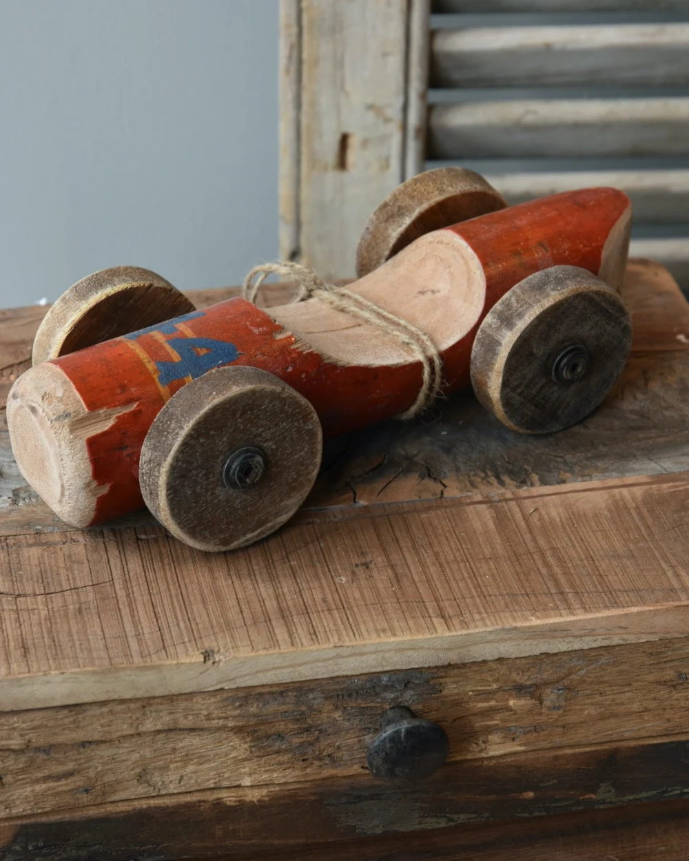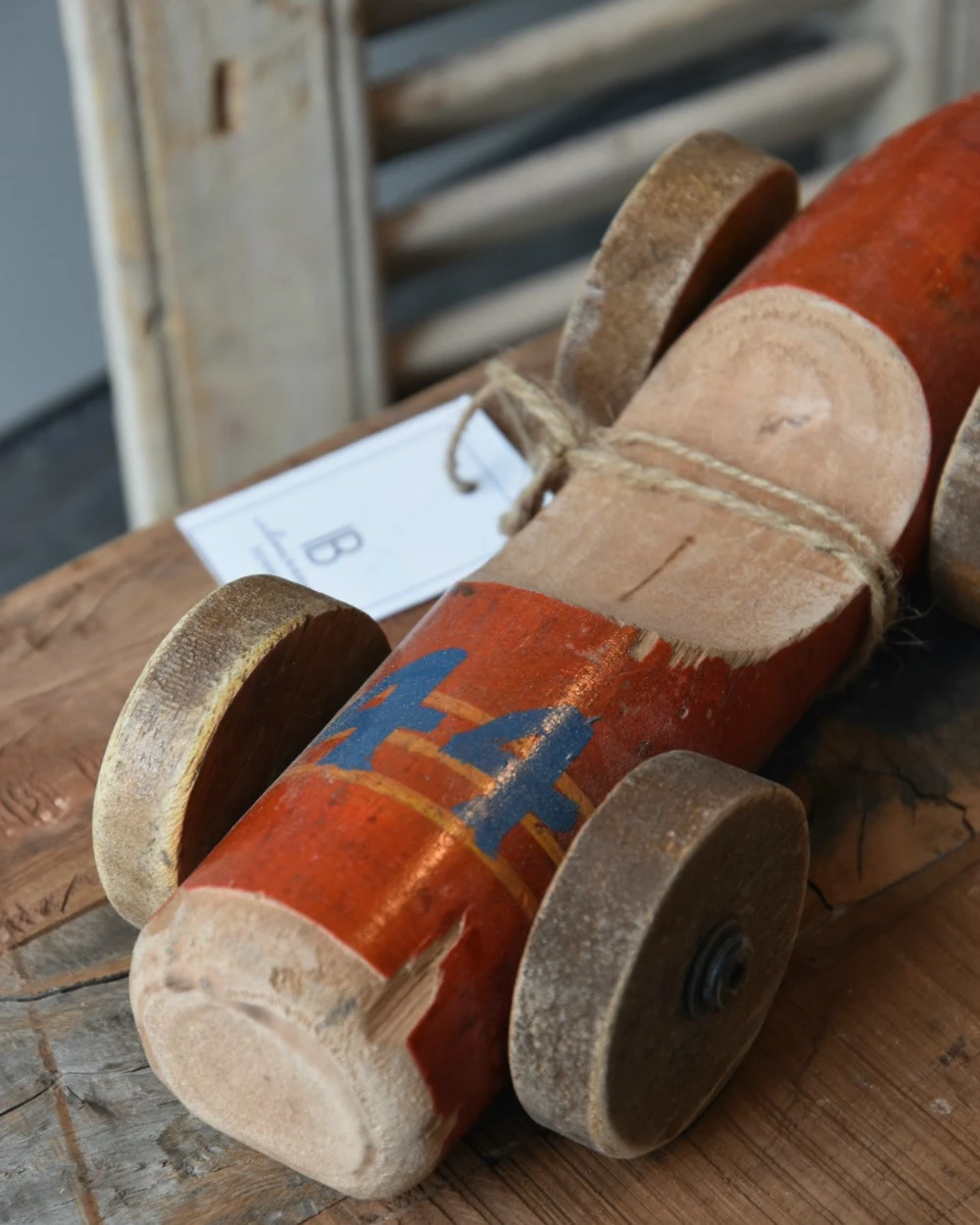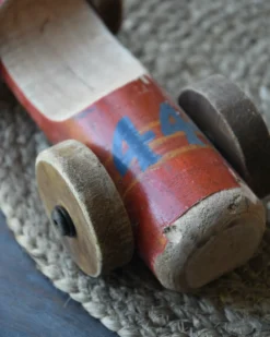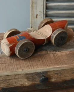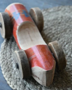Vintage race auto in het rood met blauw nr 44, IB Laursen. Deze stoere race auto is van gebruikt hout hand gemaakt, hierdoor is de auto uniek en vol karakter. De auto heeft een rode kleur met in blauw nummer 44 erop. Ook de wielen zijn van hout en met zijn geleefde uiterlijk is het echt een eye-catcher. U kunt de auto als decoratie showen in een mooie vitrinekast, op een bureau of lage kast…..