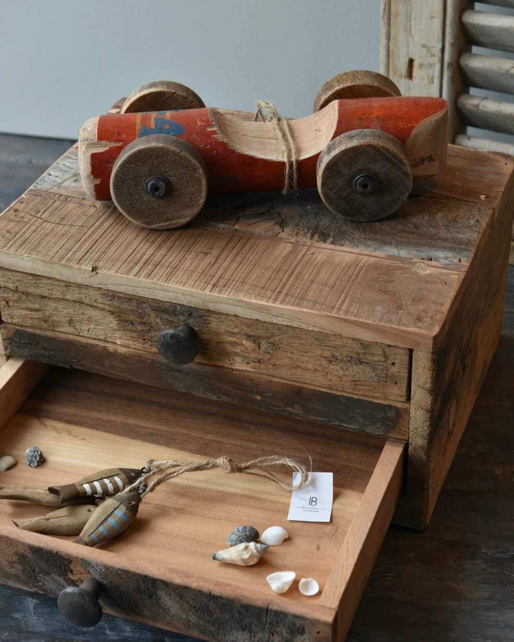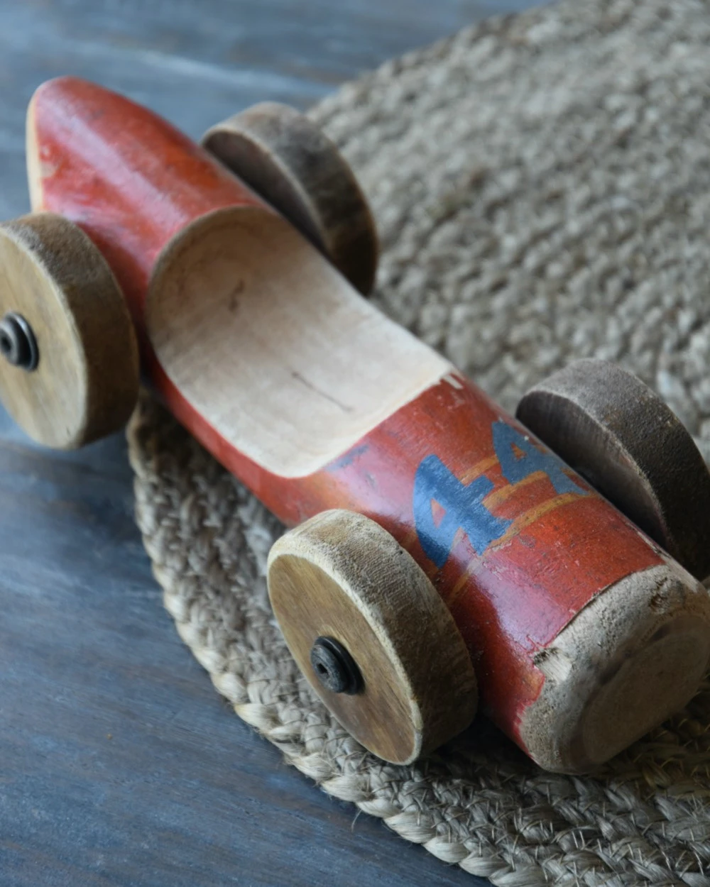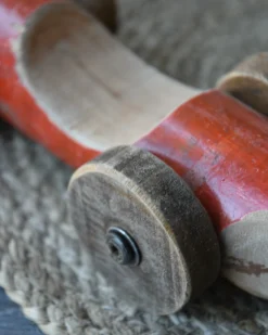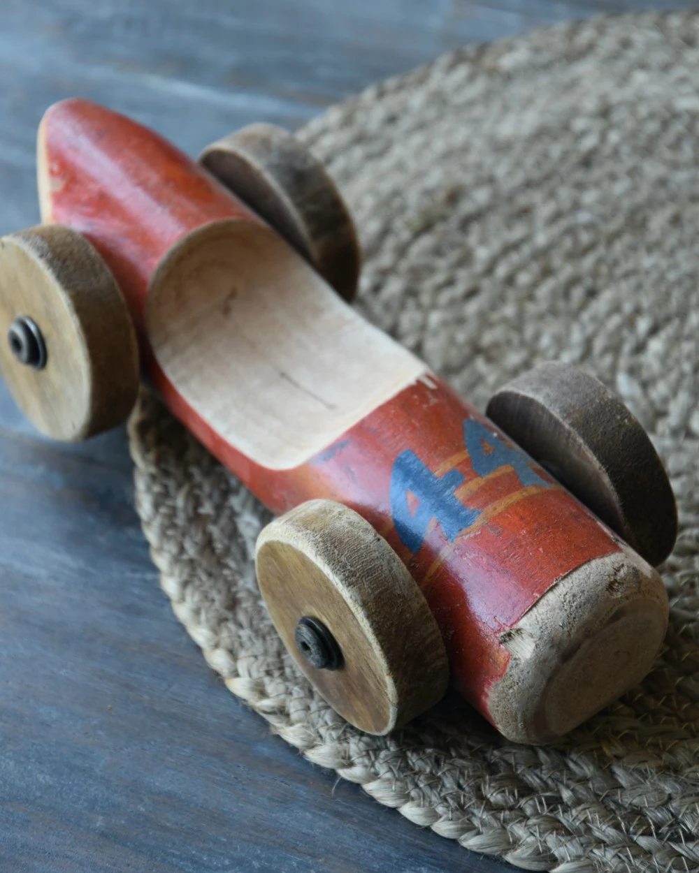 Vintage race auto in het rood met blauw nr 44, IB Laursen. Deze stoere race auto is van gebruikt hout hand gemaakt, hierdoor is de auto uniek en vol karakter. De auto heeft een rode kleur met in blauw nummer 44 erop. Ook de wielen zijn van hout en met zijn geleefde uiterlijk is het echt een eye-catcher. U kunt de auto als decoratie showen in een mooie vitrinekast, op een bureau of lage kast…..